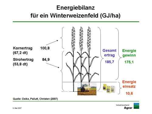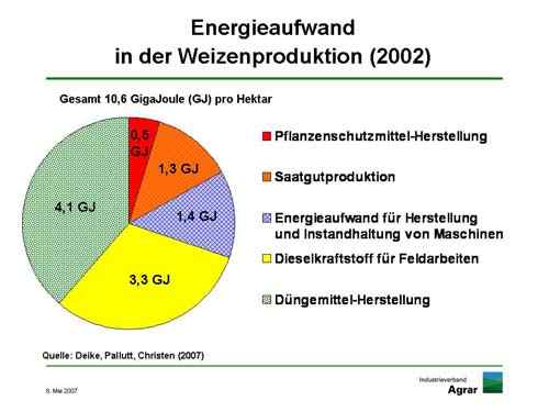 Unabhängige wissenschaftliche Institute kommen zu ähnlichen Ergebnissen. Eine Untersuchung der Biologischen Bundesanstalt für Land- und Forstwirtschaft (BBA) und der Universität Halle hat ergeben, dass für den Anbau von einem Hektar Weizen 10 GJ an Energie aufgewandt werden: Für Düngemittel, Dieselkraftstoff, Saatgut-Produktion, die Herstellung und Instandhaltung der nötigen Maschinen sowie den Pflanzenschutz.