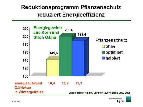 Immer wieder wird gefordert, den Einsatz von chemischen Pflanzenschutzmitteln zu reduzieren. Auch das haben die BBA-Wissenschaftler simuliert und die Dosis jeweils halbiert. Das Ergebnis gibt zu denken: Halbierter Pflanzenschutz spart 0,2 GJ pro Hektar an Energieeinsatz; dafür verzichtet man auf über 11 GJ an Energiegewinn.