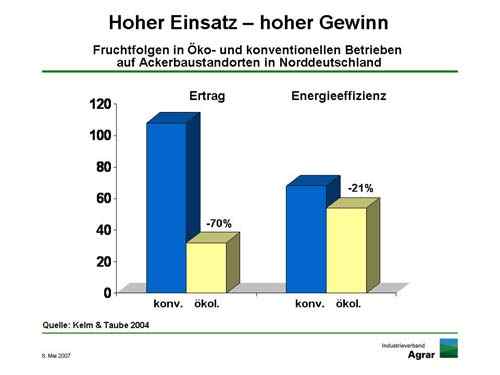 Der Biolandbau verzichtet auf Mineraldünger; dadurch erntet er erheblich weniger als konventionell wirtschaftende Betriebe. Auf guten Ackerbau-Standorten können das in einer Fruchtfolge bis zu 70 Prozent sein. Das ergaben Versuche der Universität Kiel. Das Ergebnis überrascht nicht. Überraschend ist aber, dass auch die Energieeffizienz im Biolandbau nachhinkt: Jede eingesetzte Energieeinheit brachte 20 Prozent weniger Energieertrag als im konventionellen Landbau.