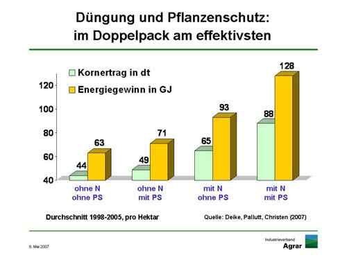 Für hohen Energiegewinn müssen die Pflanzen sowohl optimal ernährt als auch vor Schädlingen und Krankheiten geschützt werden. Dann können sich Kornertrag und Energiegewinn gegenüber einer unbehandelten Parzelle glatt verdoppeln. Düngung ohne Pflanzenschutz verbessert die Leistung um höchstens 50 Prozent, wie ebenfalls Versuche von BBA und der Universität Halle zeigten.