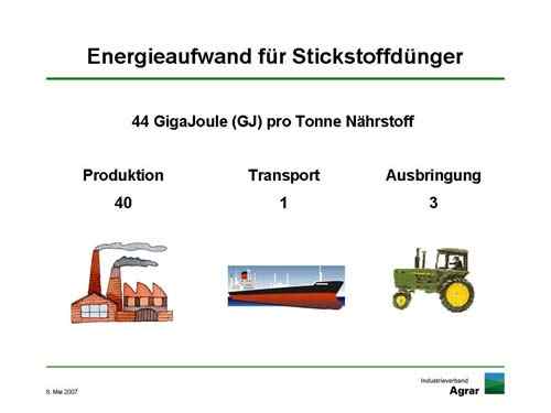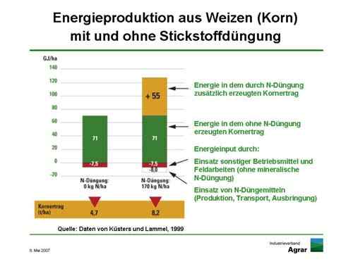 In der Pflanzenerzeugung verursacht die Stickstoffdüngung den größten Energieaufwand. Allerdings verbessert sie auch ganz erheblich den Energieertrag. Ein Beispiel: Durch eine intensive Stickstoffdüngung von 170 Kilogramm pro Hektar zu Weizen werden 3,5 Tonnen Korn mehr geerntet. Das bedeutet einen Mehrertrag an Energie von 55 Gigajoule (GJ), bei einem Einsatz von acht GJ für die Düngung.