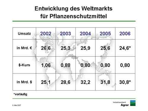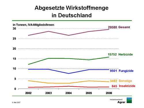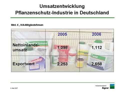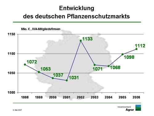 Der Nettoninlandsumsatz der Hersteller von Pflanzenschutzmitteln in Deutschland überstieg mit 1,1 Milliarden Euro leicht das Vorjahrsergebnis. Der Exportwert stieg um 400 Millionen Euro auf knapp 2,7 Milliarden. „Größere Bewegungen auf dem deutschen Markt sind selten geworden. Die leichten Schwankungen von Jahr zu Jahr sind vor allem vom Wetter bestimmt“, erklärte dazu Niels Pörksen, Präsident des Industrieverbands Agrar e. V. (IVA). Dasselbe zeigt die von den IVA-Mitgliedern abgesetzte Wirkstoffmenge von knapp 30.000 Tonnen.Der Weltmarkt für Pflanzenschutzmittel bewegte sich 2006 mit 24,6 Milliarden Euro bzw. 30,8 Milliarden US-Dollar ebenfalls in der Größenordnung, um die er seit Jahren schwankt.