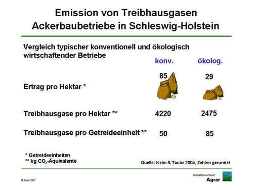 Zur Belastung mit Treibhausgasen - wie Methan, Lachgas und CO2 - trägt die Landwirtschaft in Deutschland etwa neun Prozent bei. Die konventionelle Landwirtschaft emittiert pro Hektar das 1,7-fache dessen, was in Betrieben des Ökolandbaus anfällt, wie wiederum die Universität Kiel herausfand. Das Verhältnis kehrt sich jedoch exakt ins Ge-genteil um, wenn die Rechnung an der produzierten Einheit festgemacht wird. Dann ist die moderne Landwirtschaft auf fruchtbaren Böden dem Öko-Landbau eindeutig überlegen. Nur auf benachteiligten Standorten neigt sich die Waagschale zugunsten des Ökolandbaus.