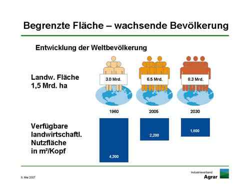 Es lässt sich klar vorhersehen, dass die Weltbevölkerung in den nächsten 20 Jahren um weitere zwei Milliarden Menschen zunehmen wird. Was abnimmt, ist die landwirtschaftliche Fläche. Pörksen machte deutlich: „Für jeden einzelnen bleibt ein immer kleinerer Flecken Land, auf dem seine Nahrung wächst, wo aber zunehmend auch Energie und nachwachsende Rohstoffe produziert werden sollen. Es führt kein Weg daran vorbei, alle Erkenntnisse der modernen Agrarproduktion zu nutzen.“
