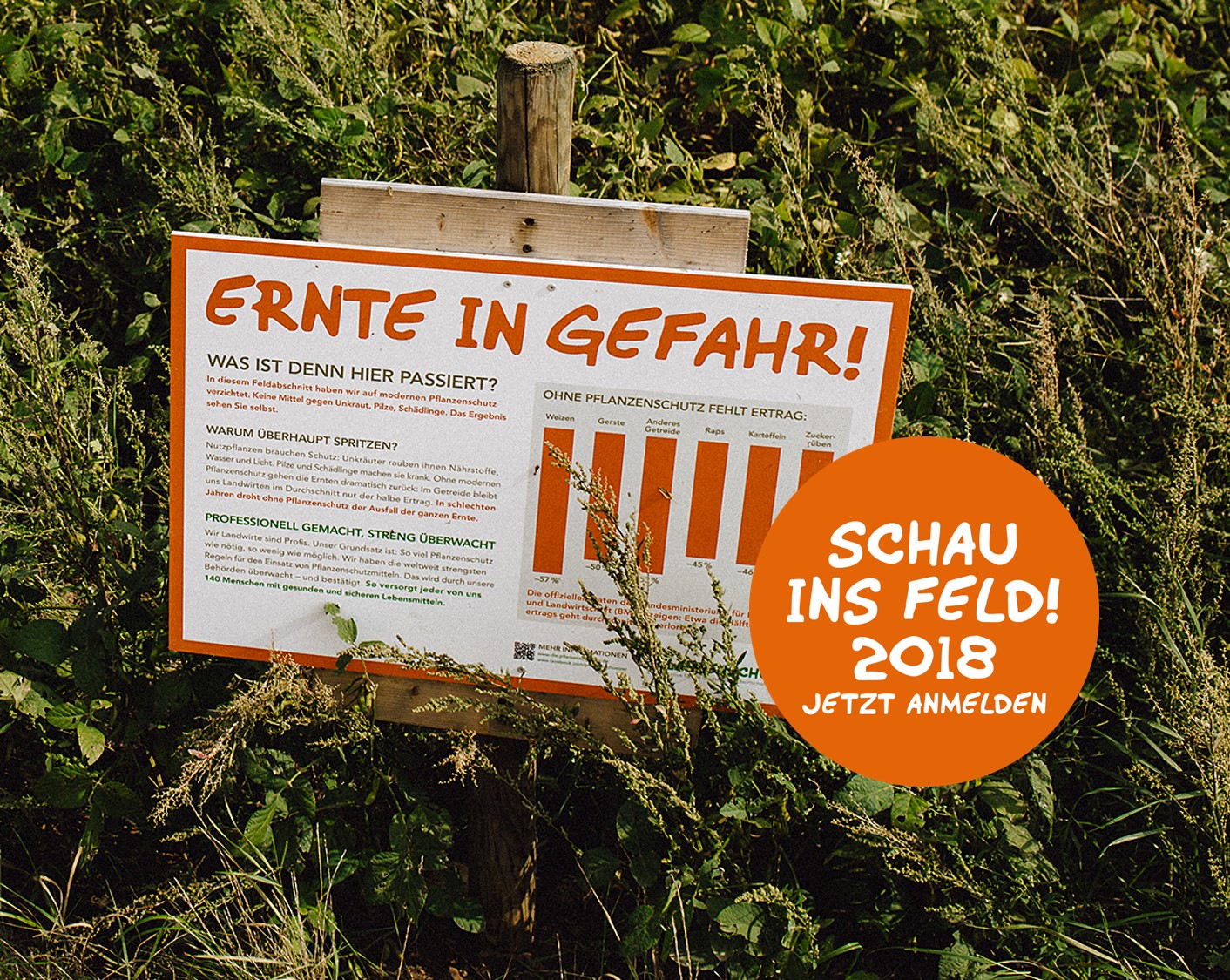 Die Anmeldung zu „Schau ins Feld!“ 2018 läuft. Bis Ende März können sich interessierte, konventionell wie ökologisch wirtschaftende Landwirte unter http://die-pflanzenschuetzer.de/schau-ins-feld/anmeldung/ registrieren und mitmachen. Alle Teilnehmer erhalten rechtzeitig kostenlos eine Schautafel zum Aufstellen an ihrem Schau!-Fenster. Auch Teilnehmer, die wiederholt dabei sind und auch gegebenenfalls ihr eingelagertes Feldschild wieder aufstellen, sind gebeten, sich erneut zu registrieren.