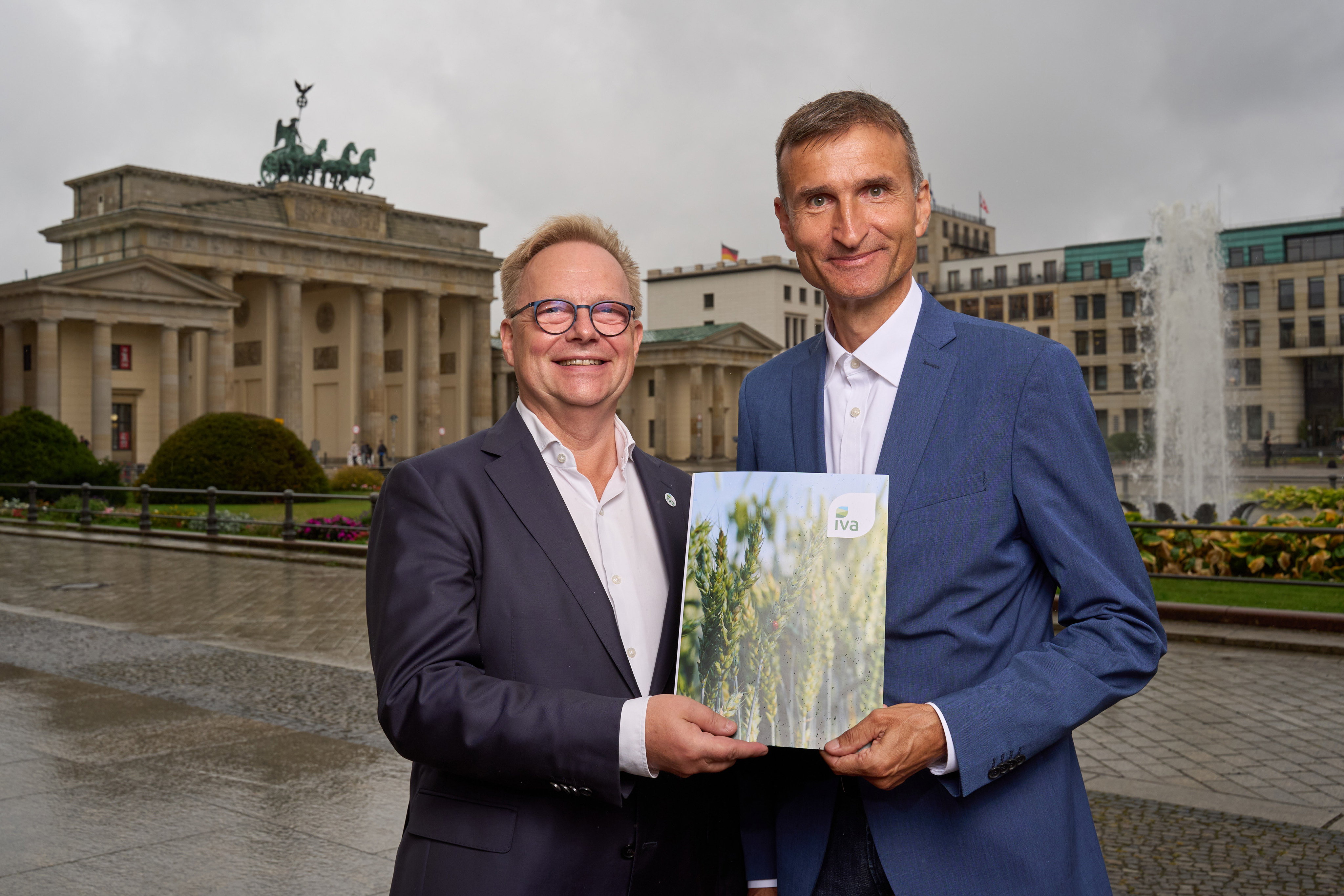 Übergabe der Studie „Klimaschutzpotential und ökonomische Bewertung exemplarischer technischer Adaptionsmaßnahmen sowie Innovationen im konventionellen Ackerbau Deutschlands“ am 9. September 2024 in Berlin. IVA-Präsident Michael Wagner (l.) und Studienautor Prof. Dr. Enno Bahrs von der Universität Hohenheim. Foto: FrankNuernberger.de