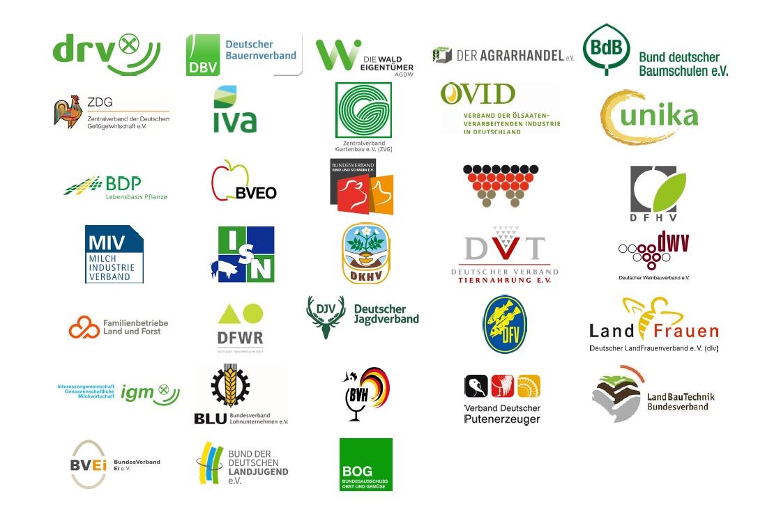 Die Verbände-Allianz besteht aus: Deutscher Raiffeisenverband e. V., Deutscher Bauernverband e. V., Arbeitsgemeinschaft Deutscher Waldbesitzerverbände e. V., Der Agrarhandel e. V., Bund deutscher Baumschulen e. V., Zentralverband der Deutschen Geflügelwirtschaft e. V., Industrieverband Agrar e. V., Zentralverband Gartenbau e. V., Verband der Ölsaatenverarbeitenden Industrie e. V., Union der Deutschen Kartoffelwirtschaft e. V., Bundesverband Deutscher Pflanzenzüchter e. V., Bundesvereinigung der Erzeugerorganisationen Obst und Gemüse e. V., Bundesverband Rind und Schwein e. V., Bundesverband der Deutschen Weinkellereien e. V., Deutscher Fruchthandelsverband e. V., Milchindustrieverband e. V., Interessengemeinschaft der Schweinehalter Deutschlands e. V., Deutscher Kartoffelhandelsverband e. V., Deutscher Verband Tiernahrung e. V., Deutscher Weinbauverband e. V., Familienbetriebe Land und Forst e. V., Deutscher Forstwirtschaftsrat e. V., Deutscher Jagdverband e. V., Deutscher Fischerei-Verband e. V., Deutscher LandFrauenverband e. V., Interessengemeinschaft Genossenschaftliche Milchwirtschaft, Bundesverband Lohnunternehmen e. V., Bundesverband bäuerlicher Hähnchenerzeuger e. V., Verband Deutscher Putenerzeuger e. V., LandBauTechnik - Bundesverband e. V., Bundesverband Ei e. V., Bund der Deutschen Landjugend e. V., Bundesausschuss Obst und Gemüse