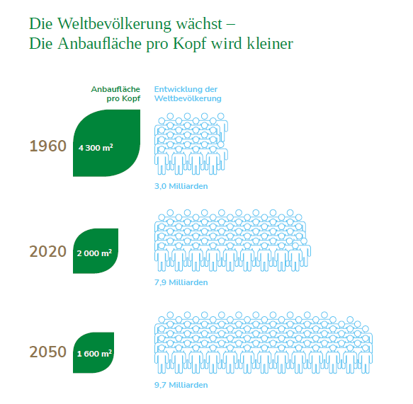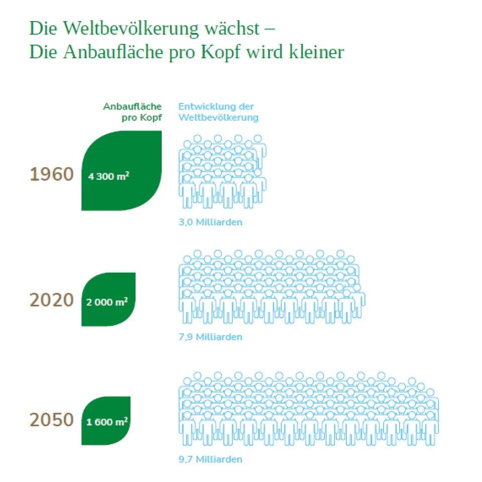 Bis zum Jahr 2050 wird die Weltbevölkerung auf rund neun Milliarden Menschen anwachsen. Die rapide wachsende Menschheit ausreichend zu ernähren ist eine große Herausforderung für die Landwirtschaft. Die Vereinten Nationen (UN) schätzen, dass die Nahrungsmittelproduktion bis zur Jahrhundertmitte um 70 Prozent steigen muss. Derzeit leidet eine Milliarde Menschen Hunger. Zugleich aber können sich mit zunehmendem Wohlstand mehr Menschen mehr und höherwertige Nahrungsmittel leisten; die Nachfrage nach Milch und Fleisch steigt. Dieser Herausforderung kann nur eine immer produktivere Landwirtschaft begegnen, die alle Möglichkeiten zur Ertragssteigerung nutzt.