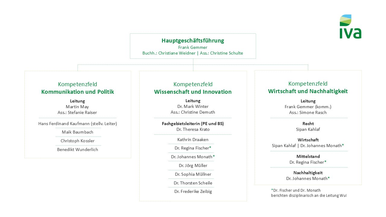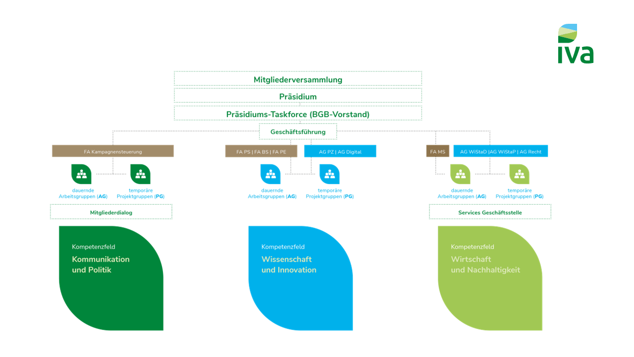 Kompetenzfelder, Zentralausschüsse, Steuerungsgremien, Fachausschüsse und Projektgruppen des IVA bearbeiten langfristig zentrale und Fachfragen. Für spezielle, zeitlich eingegrenzte Fragen werden nach Bedarf Projektgruppen eingerichtet.