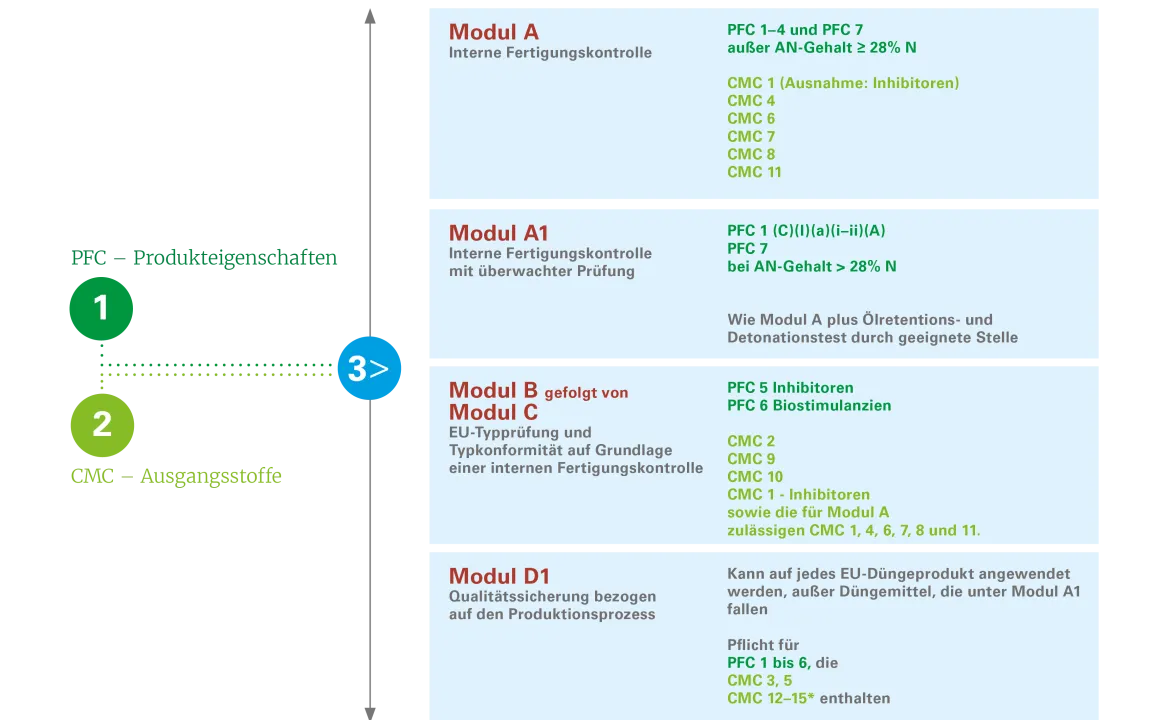 Für die Konformitätsbewertung muss ein EU-Düngeprodukt in Abhängigkeit von den Produkteigenschaften und den eingesetzten Ausgangsstoffen eines von vier Bewertungsmodulen durchlaufen. Die Funktion eines Produkts ist das erste Kriterium zur Auswahl des Konformitätsbewertungsmoduls. Die grundlegenden Anforderungen für die jeweilige Produktfunktionskategorie (PFC) sind im Anhang I der Verordnung (EU) 2019/1009 festgelegt. Das zweite Kriterium zur Auswahl des Konformitätsbewertungsmoduls ist die Zusammensetzung eines Produkts. Im Anhang II der Verordnung finden sich die grundlegenden Anforderungen für die jeweiligen Komponentenmaterialkategorien (CMC).