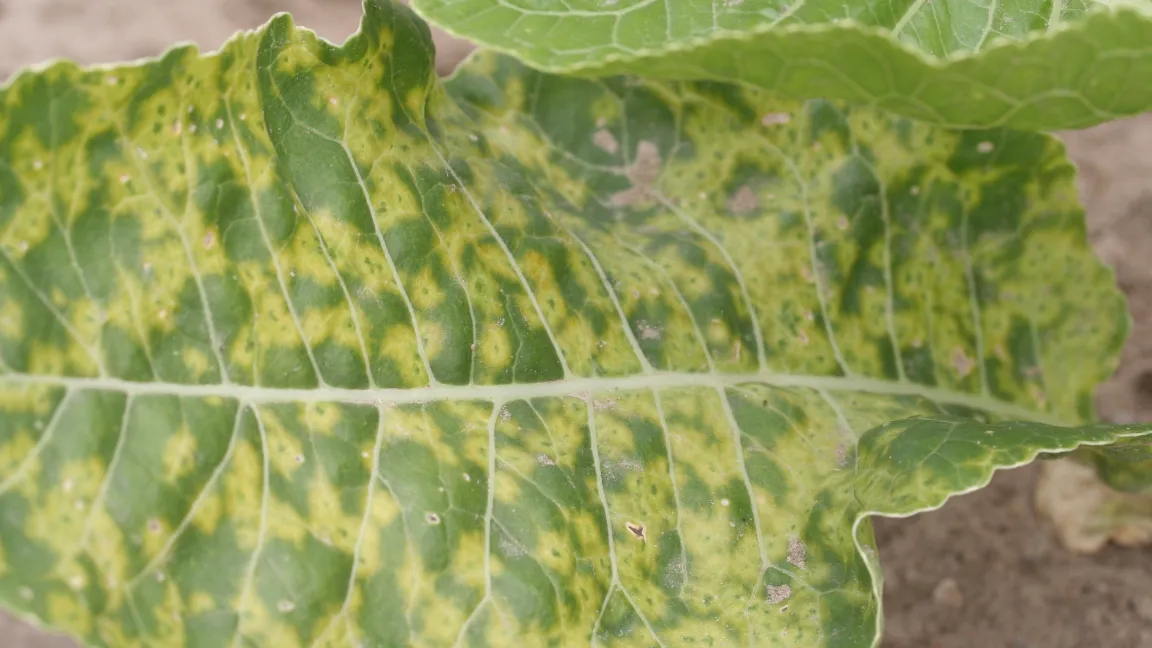 Auf fast allen untersuchten Flächen fanden die Forscher das Turnip Mosaic Virus. Typische Symptome: ringförmige Chlorosen, flächige Vergilbungen und diffuse gelbe Muster auf den Blättern. Virus-Überträger sind Vektoren wie Blattläuse, kontaminierte Werkzeuge oder der Durchwuchs der letzten Jahre, aber auch Unkraut am Feldrand. Neben strenger Hygiene verspricht vor allem gesundes Pflanzgut Erfolg. Da Meerrettich vegetativ, also über Wurzelstücke, sogenannte Fechser, vermehrt wird, vermuten die Forscher, dass in fast allen Betrieben krankes Pflanzgut verwendet wird. Für die Bekämpfung von Viren stehen keine Pflanzenschutzmittel zur Verfügung, deshalb ist gesundes Pflanzgut das A und O.
