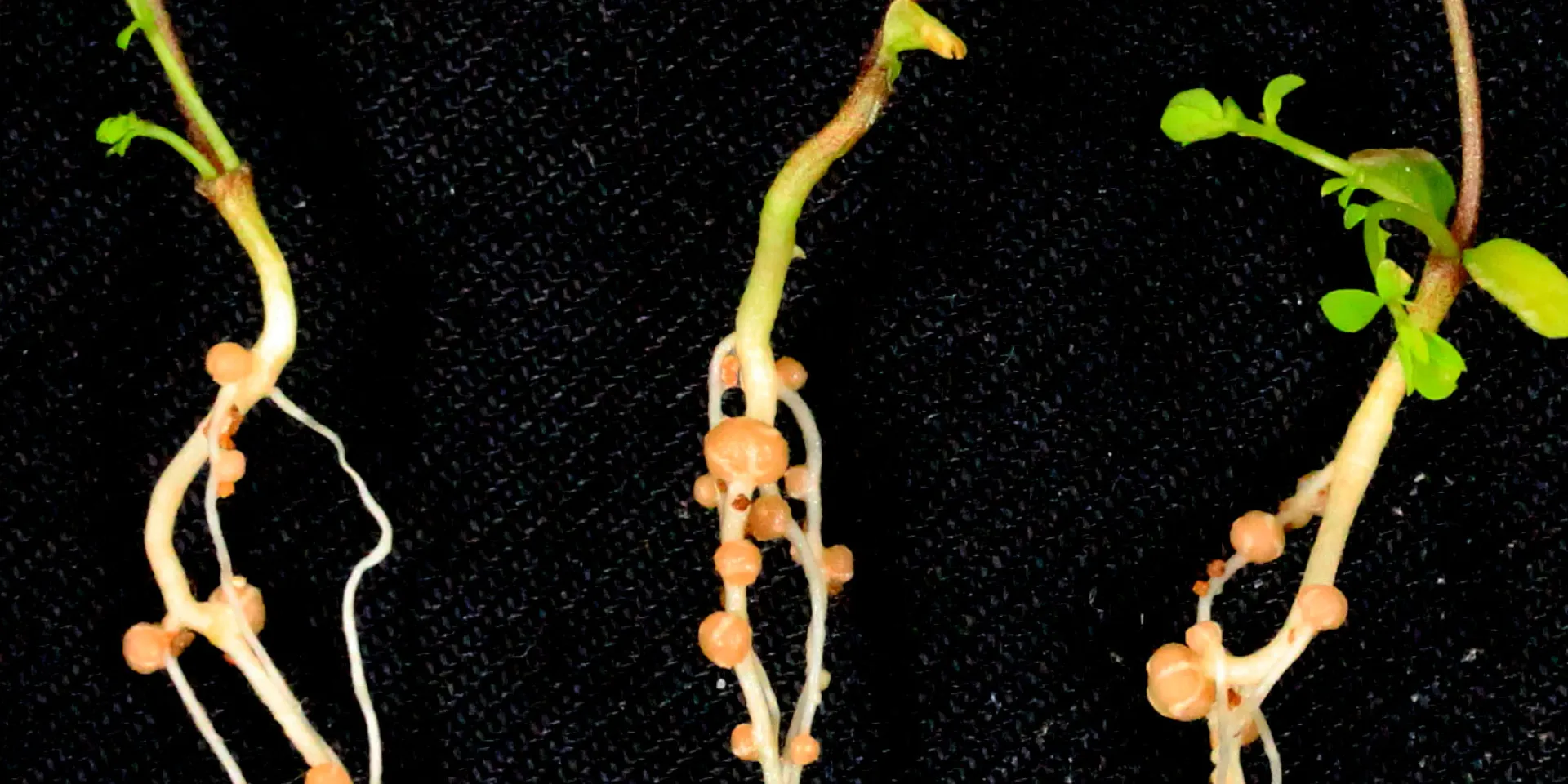 Diese Knöllchenbildung ist kein Zufall, sondern wird streng reguliert, je nachdem, wie viel Stickstoff im Boden vorhanden ist. Ist es zu wenig, senden die Wurzeln ein Notsignal (ein Peptid namens CEP1) an die Blätter. Daraufhin wird das TML-Gen, das die Knöllchenbildung blockiert, ausgeschaltet. Nun kann die Pflanze Knöllchen bilden und mehr Stickstoff aufnehmen. Es ist wie ein gut organisierter Gruppenchat, in dem alle über die Stickstoffkrise auf dem Laufenden sind.