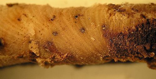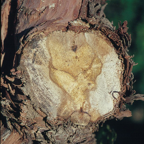 Der Name Esca kommt aus dem Lateinischen und bedeutet Zunder. Diese Krankheit, die aus hartem Holz mürben und leicht entflammbaren Zunder macht, war bereits den Römern und Griechen bekannt. Bislang galten die zwei Pilzarten Fomitiporia mediterranea, Fmed abgekürzt und Phaeomoniella chlamydospora, Pch abgekürzt, als Auslöser. Fomitiporia ist ein Weißfäulepilz*, der ursprünglich nur im Mittelmeerraum verbreitet war. Pch verursacht so genannte Tracheomykosen, das heißt, er siedelt sich in den Saft führenden Gefäßen von Pflanzen an. Im Gegensatz zu den Weißfäulepilzen befällt er auch junges Holz. Seine Anwesenheit bleibt zunächst unbemerkt. Mit fortschreitender Zerstörung der pflanzlichen Leitungsbahnen welken die Blätter, weil der Saftstrom immer mehr eingeschränkt wird.