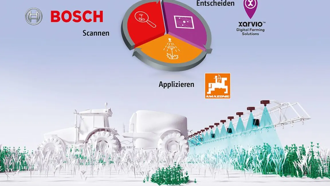 Unser SmartSprayer scannt, entscheidet und appliziert blitzschnell in Echtzeit während der Überfahrt. Die Maschine ist ein Gemeinschaftsprojekt. Bosch hat die Kameratechnik und Bildverarbeitung entwickelt. Deren Sensorik unterscheidet zwischen Kulturpflanze und Unkräutern. Die Xarvio-Software der BASF entscheidet aus dem ermittelten Unkrautbesatz unmittelbar über eine Applikation und berücksichtigt dabei Kultur, Applikationszeitpunkt sowie die kunden- und feldspezifische Strategie in der Unkrautbehandlung. Wir steuern das Pflanzenschutzgerät mit dem neuen Hightech-Spritzgestänge für die Kamera- und Lichtmodule sowie die einzeln schaltbaren Düsen bei. Für eine punktgenaue Ausbringung der Spritzbrühe muss das 36 Meter breite Gestänge während der Fahrt einen gleichmäßigen Abstand zu den Pflanzen aufweisen, auch bei unebenem Untergrund. Mit der Einzelpflanzenbehandlung erreichen wir ein neues Innovationsniveau im Pflanzenschutz.