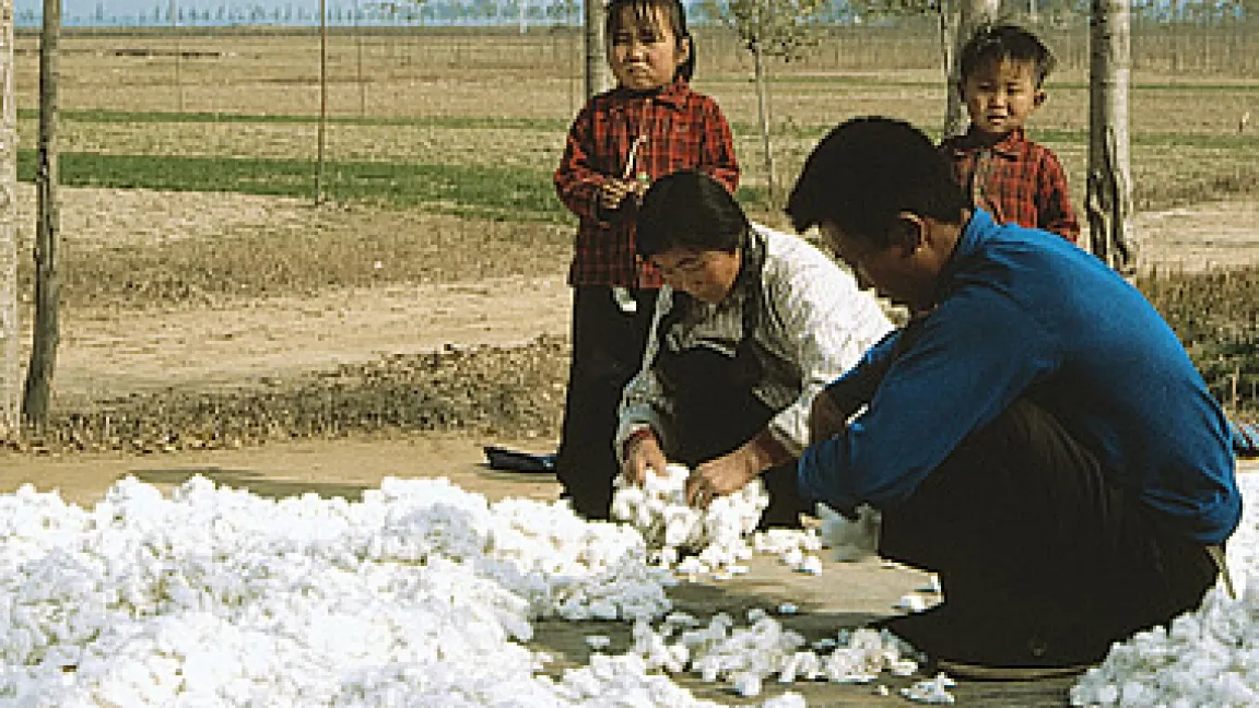 Chinesische Kleinfamilie sortiert geerntete Baumwolle.