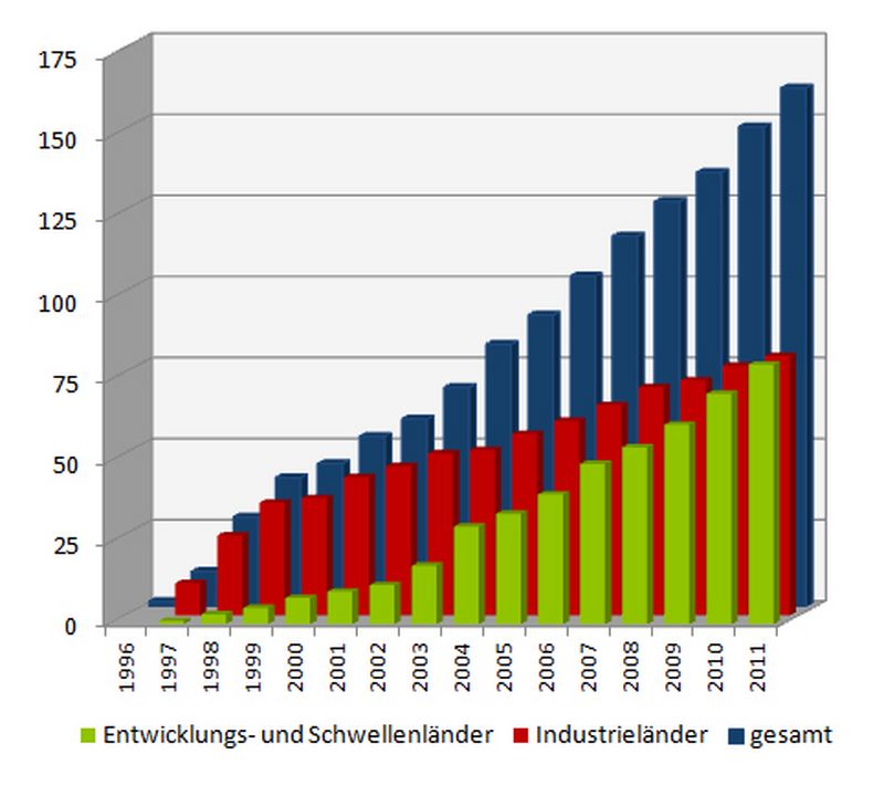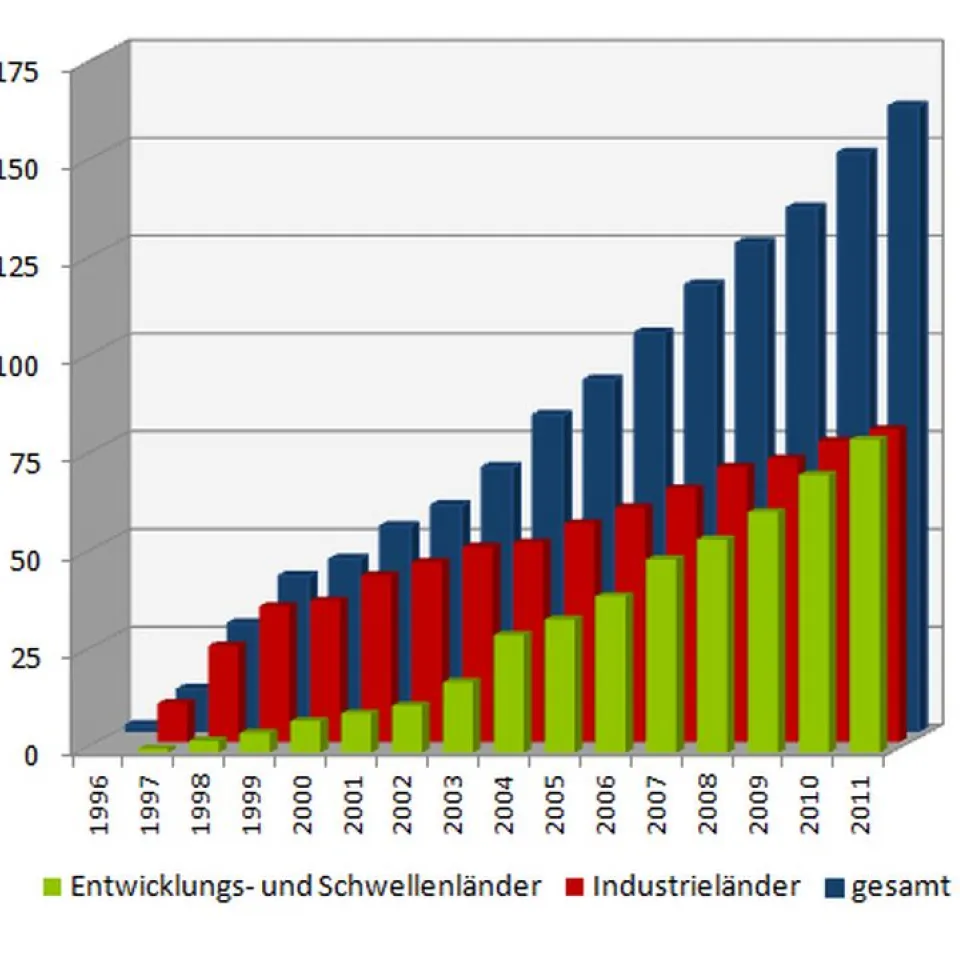 Auch 2011 sind weltweit wieder mehr gentechnisch veränderte Pflanzen angebaut worden. Die Flächen stiegen gegenüber 2010 um acht auf nunmehr 160 Millionen Hektar. Der Zuwachs war in den Entwicklungs- und Schwellenländern etwa doppelt so groß wie in den Industrieländern.Die größten Flächensteigerungen mit fünf Millionen Hektar (plus 20 Prozent) gab es in Brasilien. Neben gv-Sojabohnen stehen dort inzwischen auch gv-Mais und gv-Baumwolle auf den Feldern. Die führenden Länder beim Anbau von gv-Sorten sind die USA mit 69 Millionen Hektar, gefolgt von Brasilien mit 30,3 Millionen Hektar und Argentinien mit 23,7 Millionen Hektar. Dahinter stehen Indien und Kanada mit jeweils rund zehn Millionen Hektar. Auch China, Paraguay, Pakistan, Südafrika und Uruguay sind noch in nennenswertem Umfang dabei. Neue Länder sind 2011 nicht hinzu gekommen.