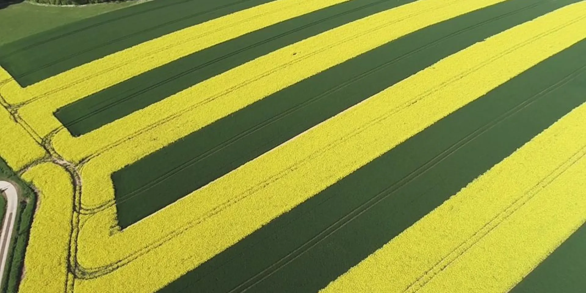 Fast schon wie ein modernes Gemälde zeigt sich der Streifenanbau von Raps und Weizen auf einem Praxisbetrieb in der Nähe von Seesen in Niedersachsen im Luftbild. Foto: G. Breustedt/Uni Kiel