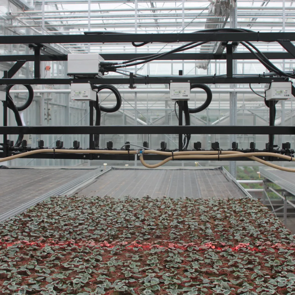 Krankheiten und Erreger früher entdecken, sie effektiver bekämpfen und dabei gezielter Pflanzenschutzmittel einsetzen – das ist „Gezonde Kas“, das Gesunde Gewächshaus. In einer deutsch-niederländischen Kooperation von 22 Unternehmen und zehn Instituten entwickelten rund 140 Personen im Projekt „Gezonde Kas“ an Tomaten und Cyclamen über vier Jahre neue Wege im Pflanzenschutz beim Unterglasanbau. Sie konstruierten ein völlig neues Pflanzenschutzkonzept in einem geschlossenen System, in dem sie 25 technische Bausteine aufeinander abstimmten.Sensorgesteuerte Pflanzenschutzmittelanwendung