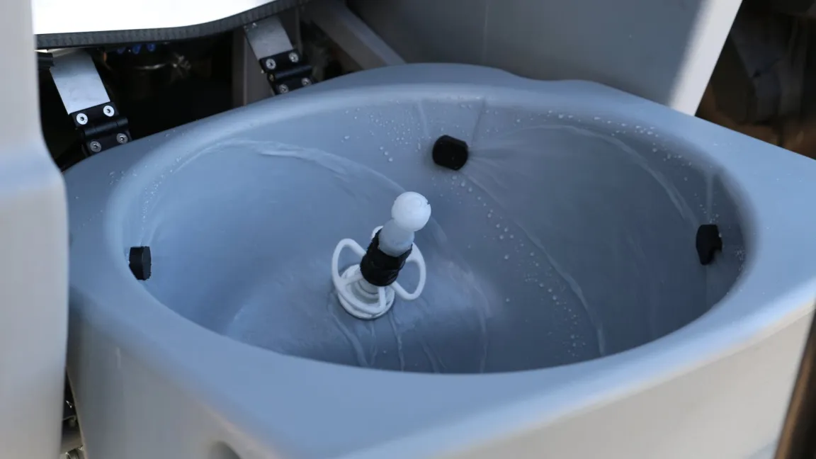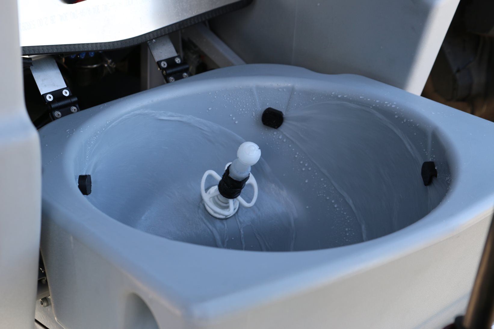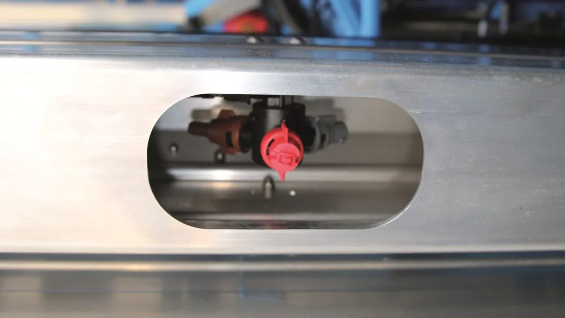 Der Polyethylenbehälter für die Spritzbrühe ist das zentrale und größte Bauteil des Pflanzenschutzgeräts. Er kann zum Beispiel 5000 Liter fassen, was je nach Aufwandmenge für 15 und 30 Hektar ausreicht. Pflanzenschutzmittel sind darin stark verdünnt enthalten. Je nach Mittel liegt das Verhältnis bei 1:100 bis 500, manchmal sogar bei 1:10 000. Ein Rührwerk sorgt dafür, dass die Konzentration in der Spritzbrühe gleichmäßig verteilt wird. Ist der Behälter nach dem Ausbringen leer, schaltet der Landwirt die Spülung ein. Innen befinden sich mehrere Reinigungsdüsen, die mit Frischwasser aus einem separaten Tank Reste der Spritzbrühe aus dem Behälter und den Leitungen spülen. Die auf diese Weise stark verdünnte Spritzbrühe wird über die Düsen auf dem Feld verteilt und stellt keinerlei Gefahr für die Umwelt dar.
