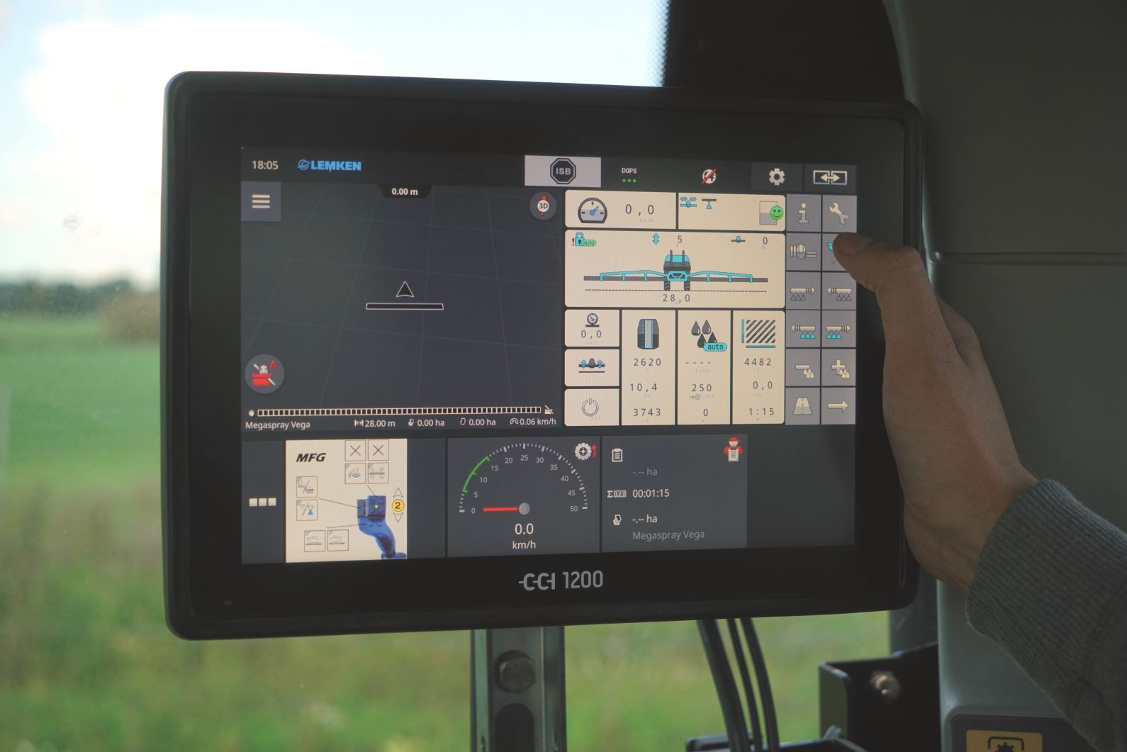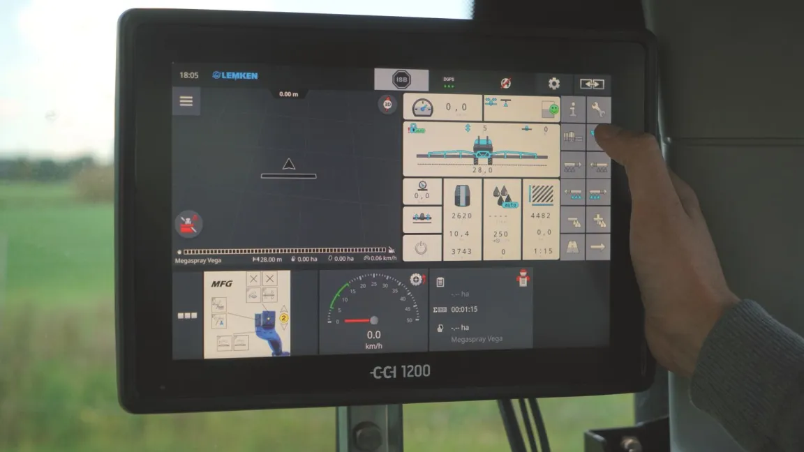 Die Pflanzenschutz-Spritze bedient der Anwender über ein Terminal per Touchscreen bequem vom Schleppersitz aus. Damit schaltet er sein Gerät ein, betätigt die Innenspülung oder legt die auszubringende Flüssigkeitsmenge pro Hektar fest. Das Terminal regelt dementsprechend die Ausbringung in Abhängigkeit der Fahrgeschwindigkeit und teilt nützliche Informationen wie Hektarleistung mit der vorhandenen Spritzbrühe mit. Heute kann die Technik aber noch viel mehr. Der Landwirt sendet beispielsweise Arbeitsaufträge vom Büro direkt an das Terminal. Das ist besonders interessant für Betriebe mit Mitarbeitern oder Aushilfen. Diese brauchen mit der Spritze nur noch zum Feld fahren, und das Terminal setzt alle zuvor mitgeteilten Vorgaben um. Nach getaner Arbeit erfolgt vom Terminal eine Meldung ans Büro. Der Landwirt nutzt diese Meldung, um die gesetzlich geforderte Dokumentation der Pflanzenschutz-Maßnahme zu erfüllen. Im Terminal werden auch die GPS-Informationen verarbeitet und zum Beispiel für die Düsensteuerung umgesetzt.