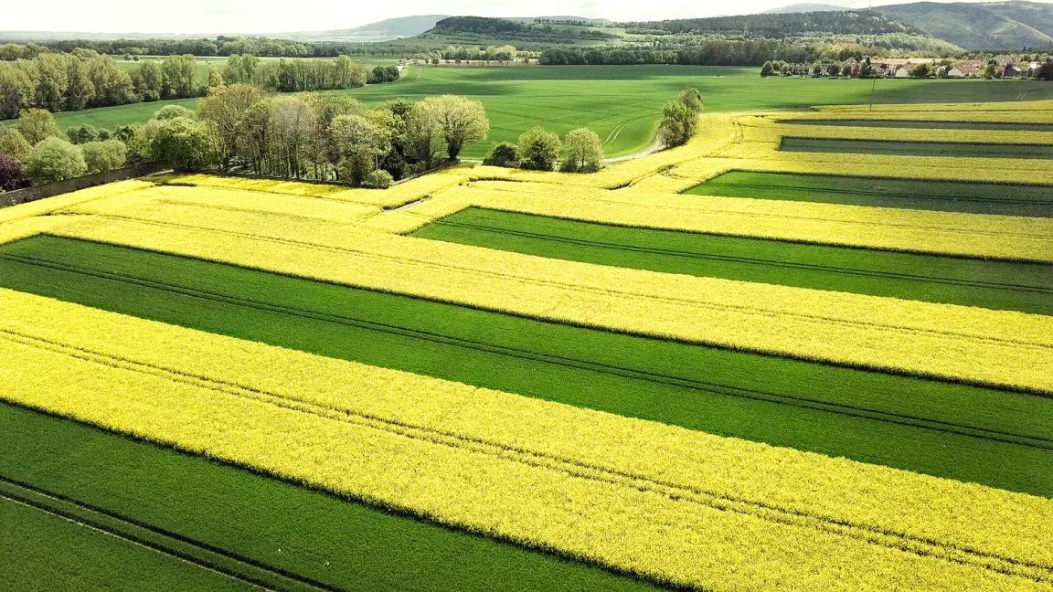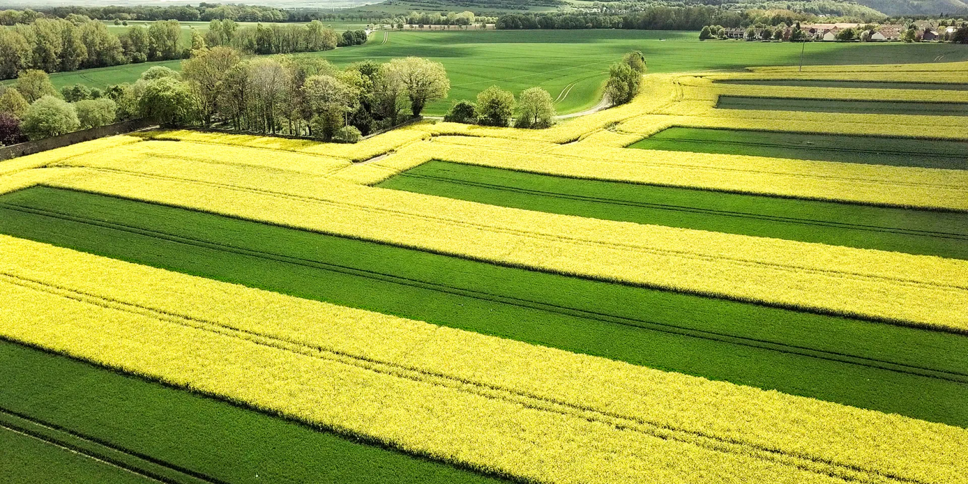 Acker mit Winterweizen und Winterraps im Streifenanbau. Foto: Uwe Holst/Universität Göttingen