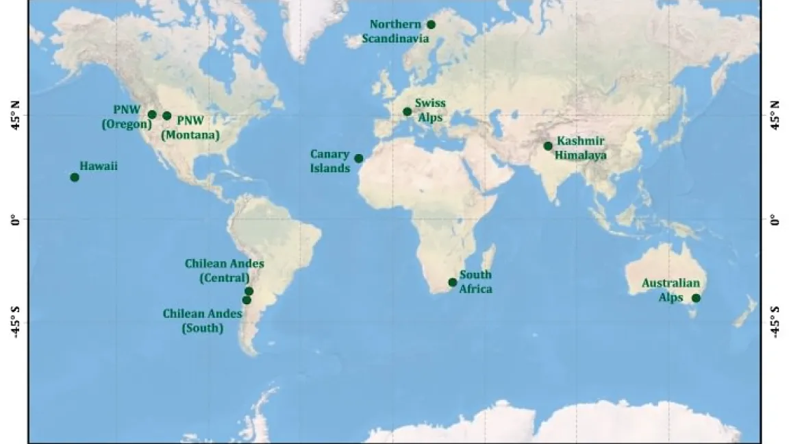 in Gebirgen von der tropischen bis zur arktischen Klimazone. Das Kernprogramm umfasst vergleichende Untersuchungen in neun Gebirgsregionen auf allen Kontinenten sowie auf verschiedenen ozeanischen Inseln. Der Norden Skandinaviens gehört ebenso dazu wie die Schweizer Alpen, die Kanarischen Inseln, die Chilenischen Anden, oder Hawaii. Eine Datenbank umfasst momentan 1 500 nicht-heimische und invasive Pflanzenarten. Die meisten kommen nur in einer einzigen Region vor. Als problematisch gelten insbesondere Gehölzpflanzen, wie Besen- und Stechginster, sowie Arten, die als Zierpflanzen eingeführt wurden.
