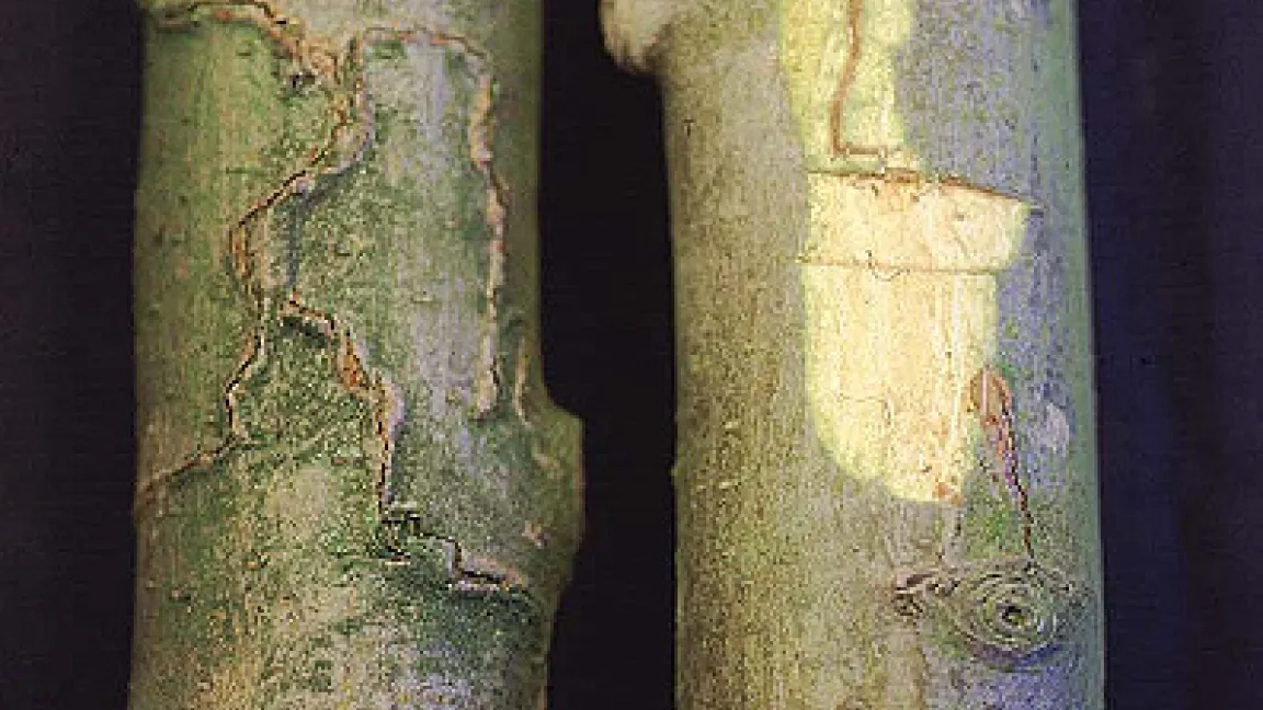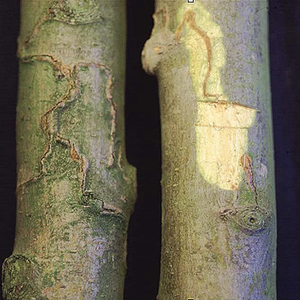 Rindenfraß der Larve des Prachtkäfers an der Eberesche (links), im Ausschnitt (rechts).