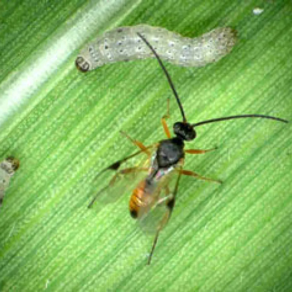 Maispflanzen schützen sich, indem sie die Feinde ihrer Feinde anlocken: Auf dem Maisblatt sitzen Raupen, die sich von Mais ernähren, sowie eine parasitische Wespe, die die Raupen angreift.