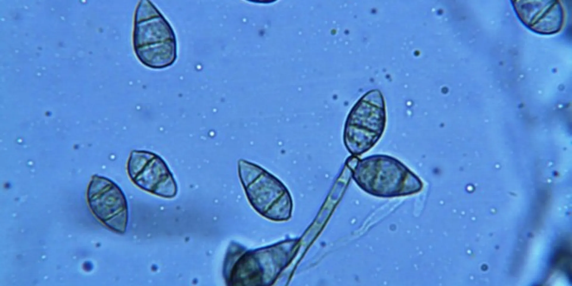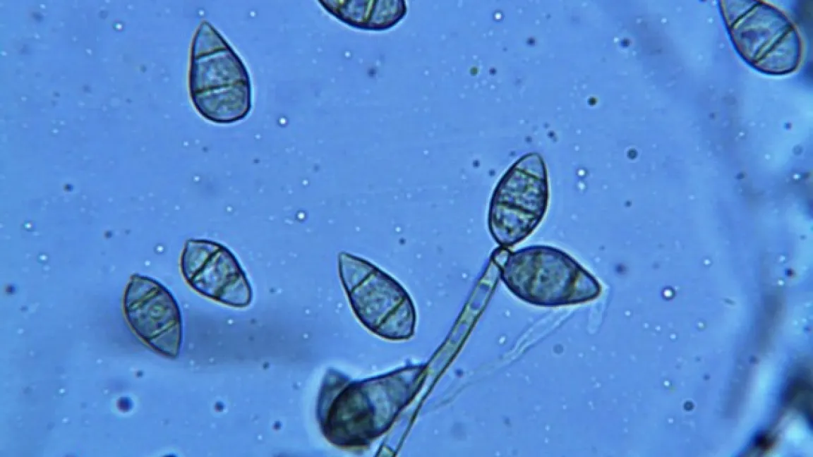 Der Erreger des Reisbrands, der Pilz Magnaporthe oryzae. Um in befallene Pflanzen einzudringen, treiben die Sporen mit enormem osmotischem Druck Keimschläuche durch die Blattoberfläche. Der Pilz befällt nicht nur Reis, sondern auch andere wichtige Getreidearten wie Weizen, Roggen, Gerste und Perlhirse. Foto: Donald Groth, Louisiana State University AgCenter, Bugwood.org, Gemeinfrei