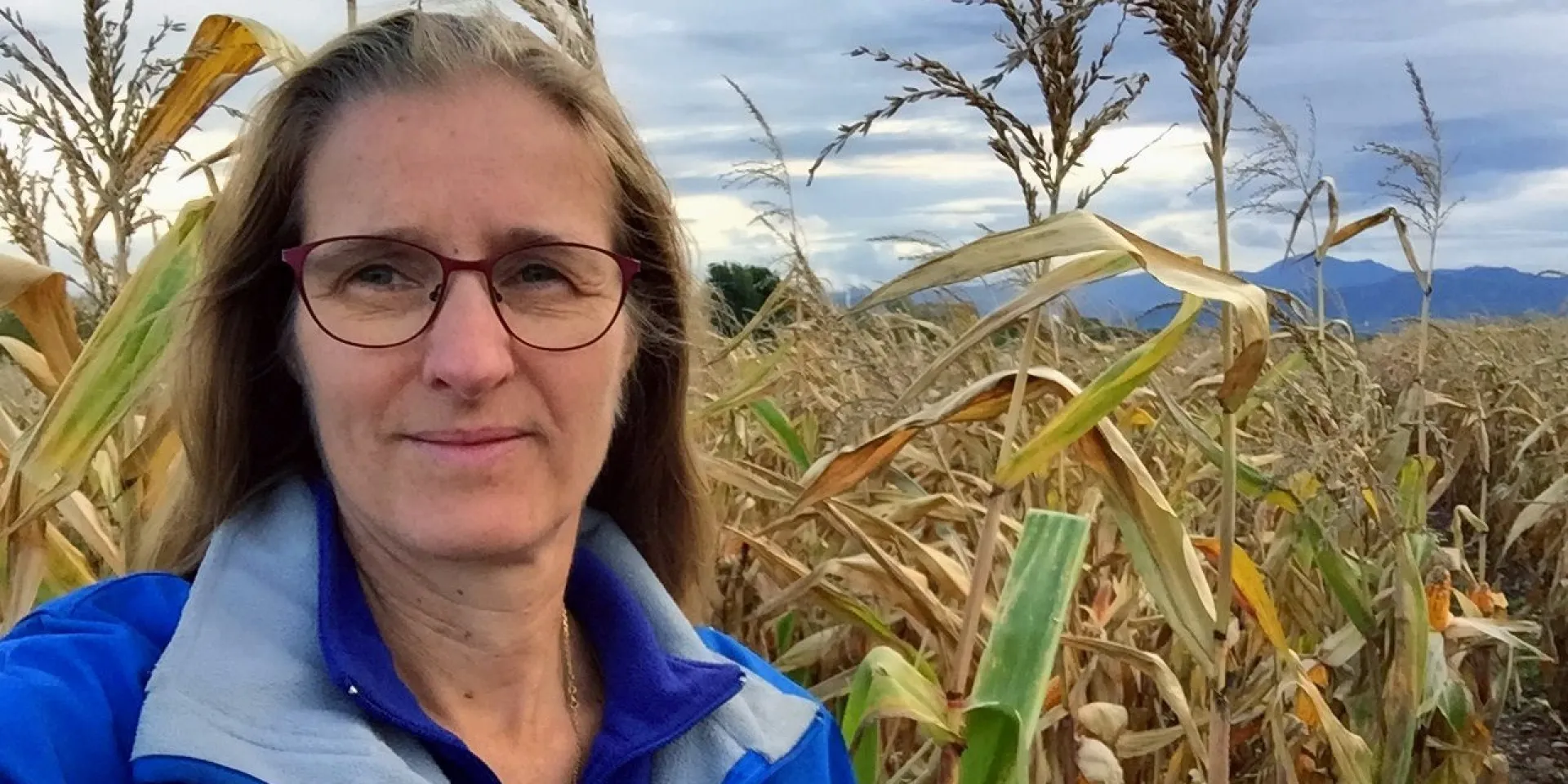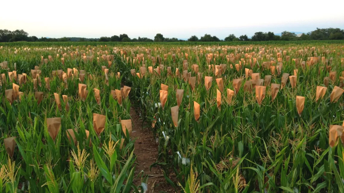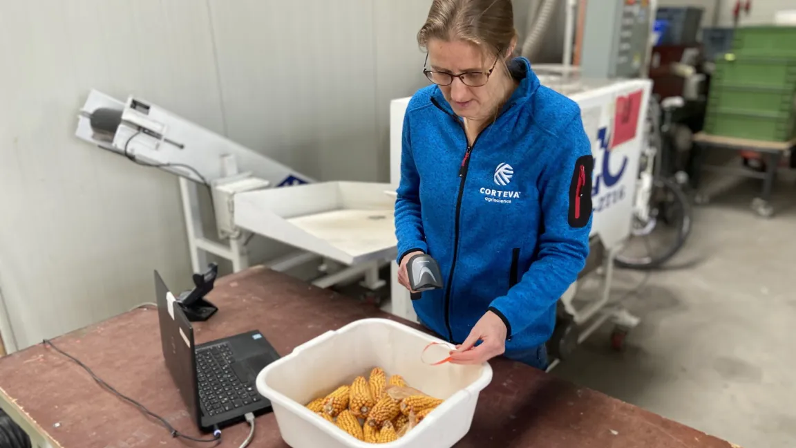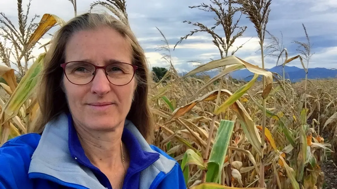 Maiszüchterin Dr. Susanne Groh im Zuchtgarten, wo die Elternlinien kurz vor der Ernte begutachtet werden. Foto: Corteva Agriscience