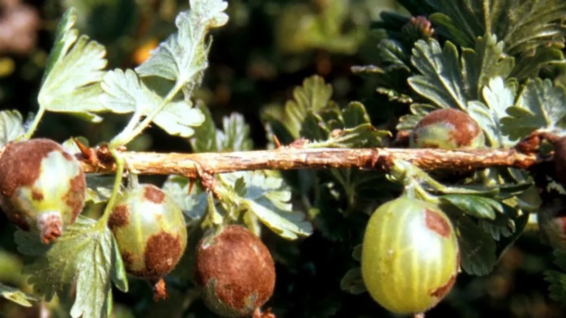 Das Schadbild an Stachelbeeren ist ähnlich. Hier fallen besonders im Winter die korkenzieherartig verkrümmten und gestauchten Triebspitzen auf. Im Frühjahr werden die Triebe, Blätter und Früchte mit dem anfangs weißlichen, später sich bräunlich verfärbenden Pilzbelag überzogen. Die Triebspitzen sterben ab. Die Pflanze bildet immer wieder neue Ersatztriebe, die ebenfalls befallen werden. Infizierte Blätter werden meist vorzeitig abgeworfen, sodass die Sträucher schon im Spätsommer kahl sein können. Bei mehrere Jahre andauerndem Befall werden sie nach und nach geschwächt und auch frostanfälliger als gesunde Pflanzen. Schließlich führt die Infektion der Früchte dazu, dass diese nicht ausreifen, manchmal gar aufplatzen und wegen des Pilzbelags letztendlich nicht mehr verwertbar sind. Auch bei Stachelbeeren ist die Krankheitsanfälligkeit der einzelnen Sorten unterschiedlich. Weniger bis kaum anfällig sind unter anderem die Sorten ´Dr. Bauer´s Rokula´, ´Hinnonmäki gelb´, ´Reflamba´, ´Rolanda´, ´Rote Eva,´ ´Rixanta´, ´Risulfa´ oder ´Invicta´. In letzter Zeit wurde örtlich festgestellt, dass sich die Krankheitsanfälligkeit bei ´Invicta´ erhöht zu haben scheint.