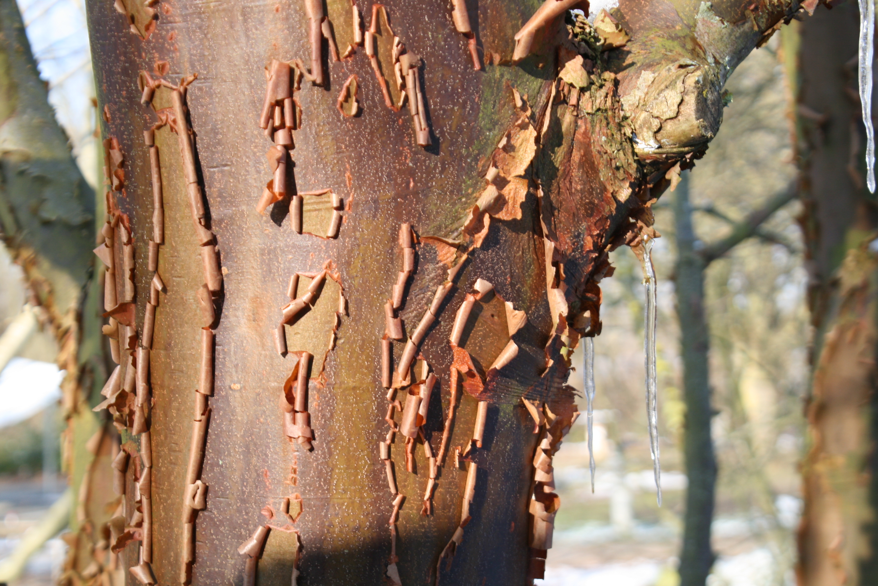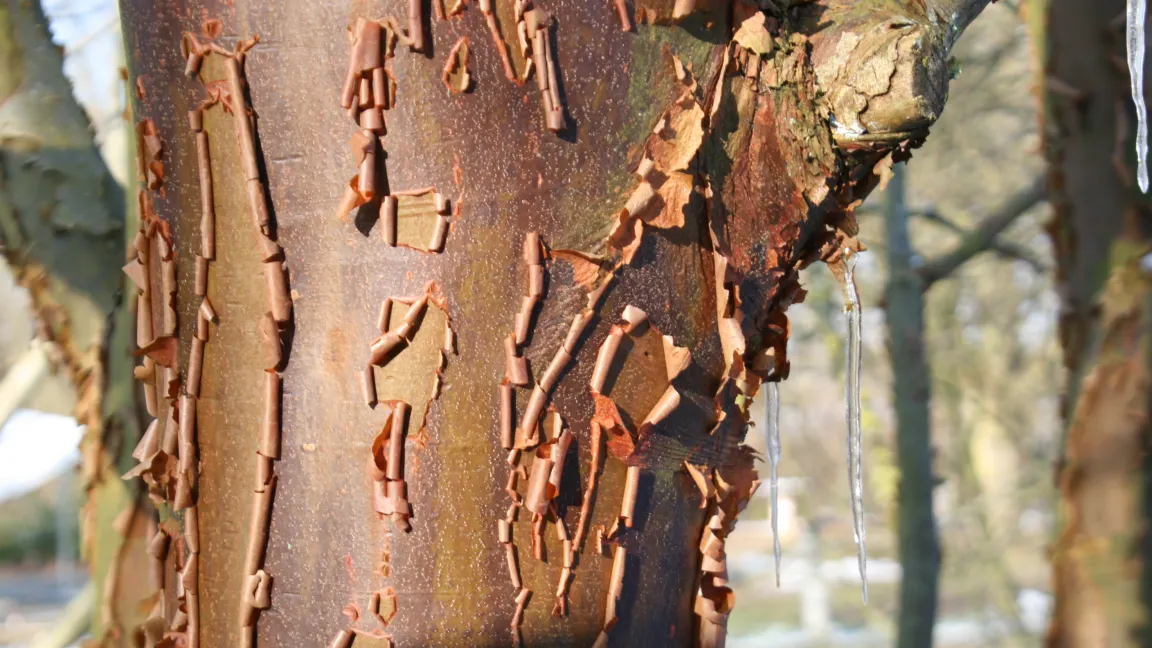 Der Zimt-Ahorn Acer griseum dagegen bildet eine kupferbraun glänzende, ähnlich wie bei Birken abrollende Rinde. Eine ähnliche, kupferglänzende Rinde besitzt auch die Tibetanische Bergkirsche oder Mahagoni-Kirsche Prunus serrula.