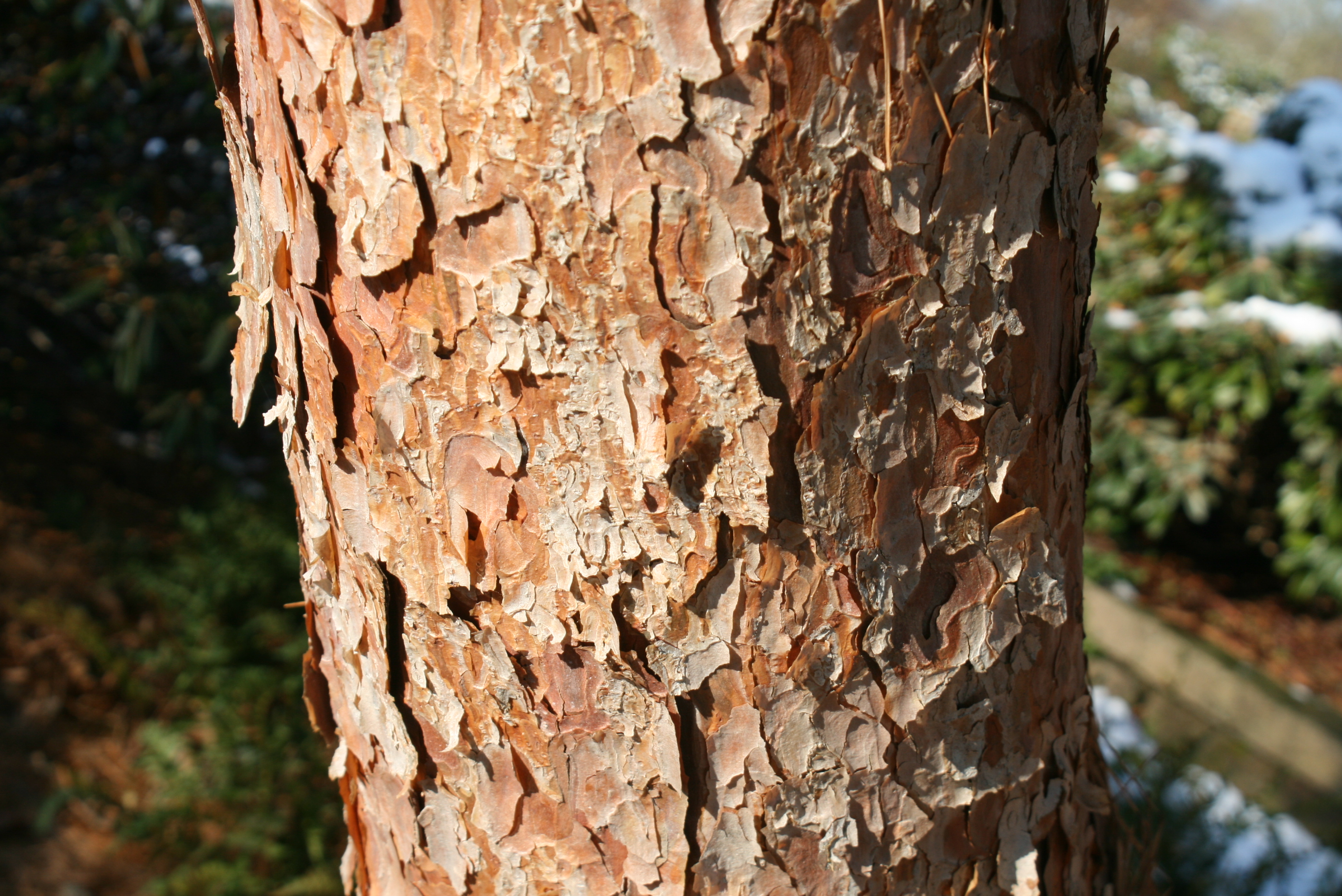 Bei der Aufzählung von Bäumen mit schöner Rinde dürfen Kiefern nicht fehlen. Die heimische Föhre Pinus sylvestris bildet eine wunderschöne, rotbraune, abschuppende Rinde, passt aber wegen ihres starken Wachstums schlecht in Hausgärten. Dort wird oft die Sorte Pinus sylvestris 'Watereri' gepflanzt, die die gleiche rotbraune Rinde bildet, aber nur etwa 3 bis 5 Meter hoch und breit wird. Auch die Österreichische Schwarzkiefer Pinus nigra ssp. nigra bekommt im Alter eine sehr schöne Borke, die sich durch ihre deutlich gröberen Schuppen mit tiefen Rissen auszeichnet. Für die meisten Hausgärten wächst sie allerdings zu stark, dort eignen sich kompakt wachsende Sorten wie Pinus nigra 'Select'.