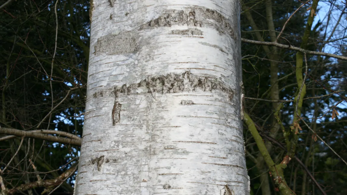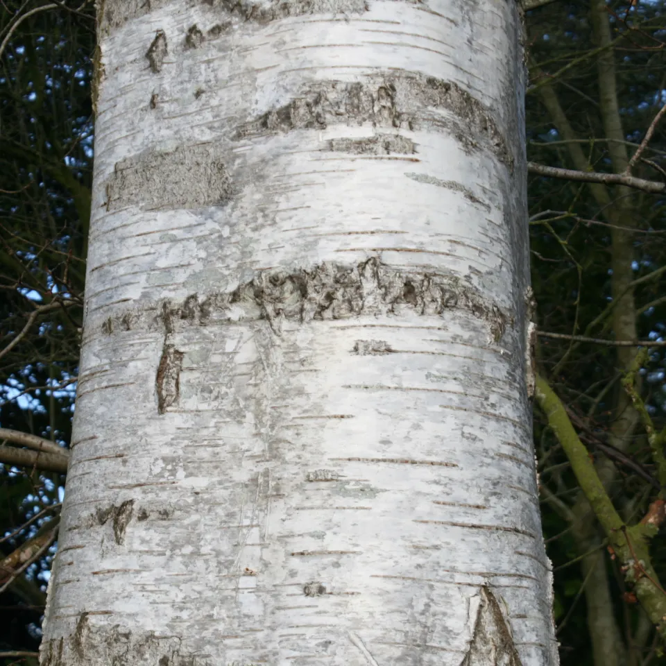 Die weiße Rinde der Birken ist ihr auffälligstes Merkmal, hier eine Sandbirke Betula pendula.
