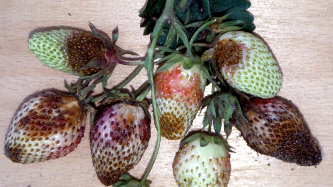 Die Grauschimmelfäule (Botrytis cinerea) ist die bedeutendste Krankheit an Erdbeerfrüchten. Hauptsächlich während der Blütezeit dringt der Erreger über Staubgefäße, Kelch- und Blütenblätter in den Blütenboden ein. Er kann aber auch an jeder anderen Stelle infizieren. Bei Kontakt der Beeren mit dem Boden oder mit befallenen Früchten infizieren sich die Seitenflächen. Feuchtes Wetter während der Blütezeit fördert den Befall, ebenso feuchte Lagen und zu enge Pflanzabstände. Auf infizierten Erdbeeren bilden sich bräunliche Flecken. Die Früchte werden weichfaul, und es entwickelt sich ein grauer Schimmelrasen. Zugelassene Fungizide können vor, während und zum Ende der Hauptblüte eingesetzt werden.