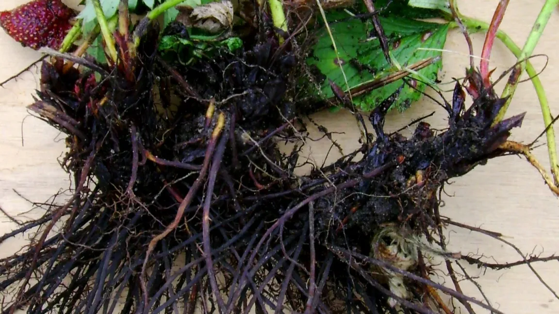 Die Schwarze Wurzelfäule hat mehrere Ursachen: Ein Komplex pilzlicher Erreger aus verschiedenen Gattungen, Bakterien, parasitische Bodennematoden und ungünstige Standortbedingungen. Sie geht von den Faser- und Seitenwurzeln aus und greift später auf die Hauptwurzeln über. Befallene Wurzelteile verfärben sich schwarz, vermorschen und lassen sich leicht vom noch weißen Zentralzylinder abziehen. Ist das Wurzelsystem einmal geschädigt, kümmern die Pflanzen und welken häufig zur Erntezeit. Sie bilden wenig oder gar keine Jungpflanzen. Die Früchte bleiben klein, werden notreif und vertrocknen. In Trockenperioden stirbt dann die ganze Pflanze ab. Befallene Jungpflanzen bilden nur kleine, vielfach gelbliche Blätter und sterben oft noch vor der ersten Ernte ab.