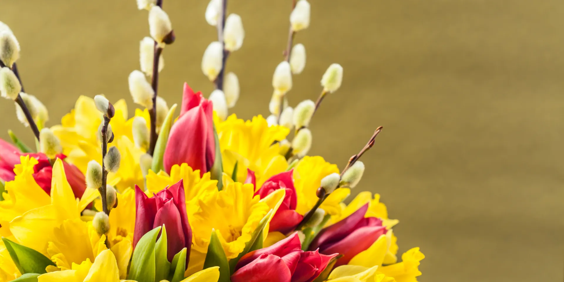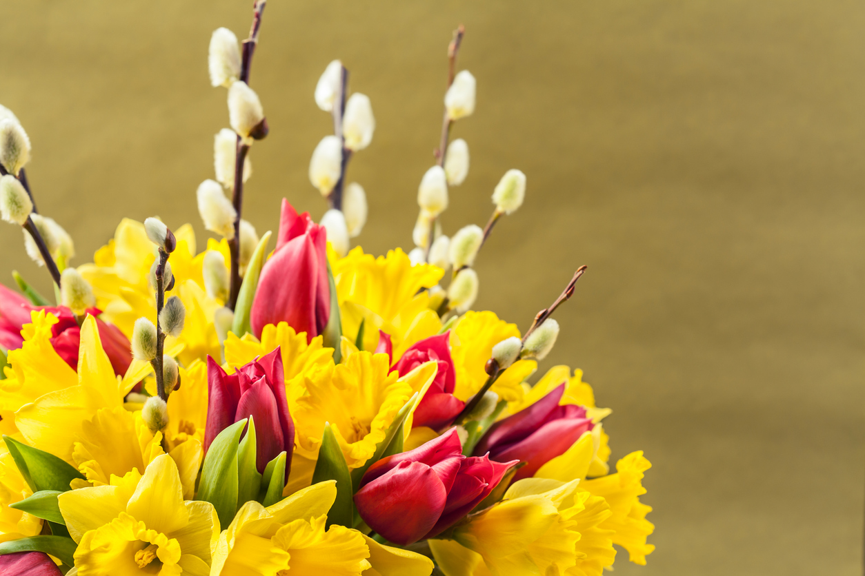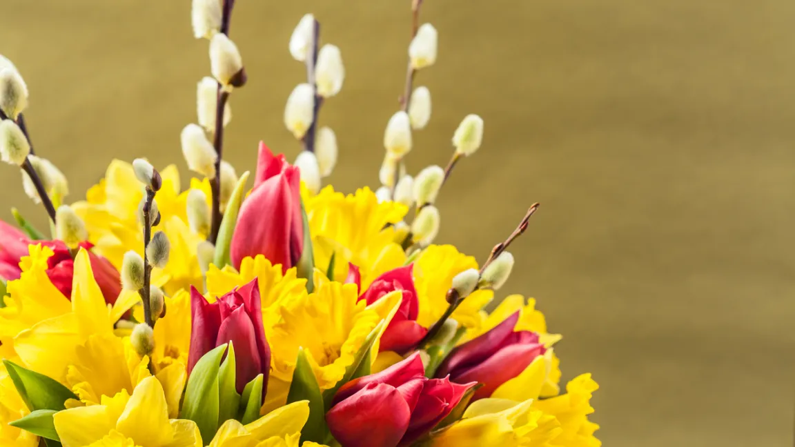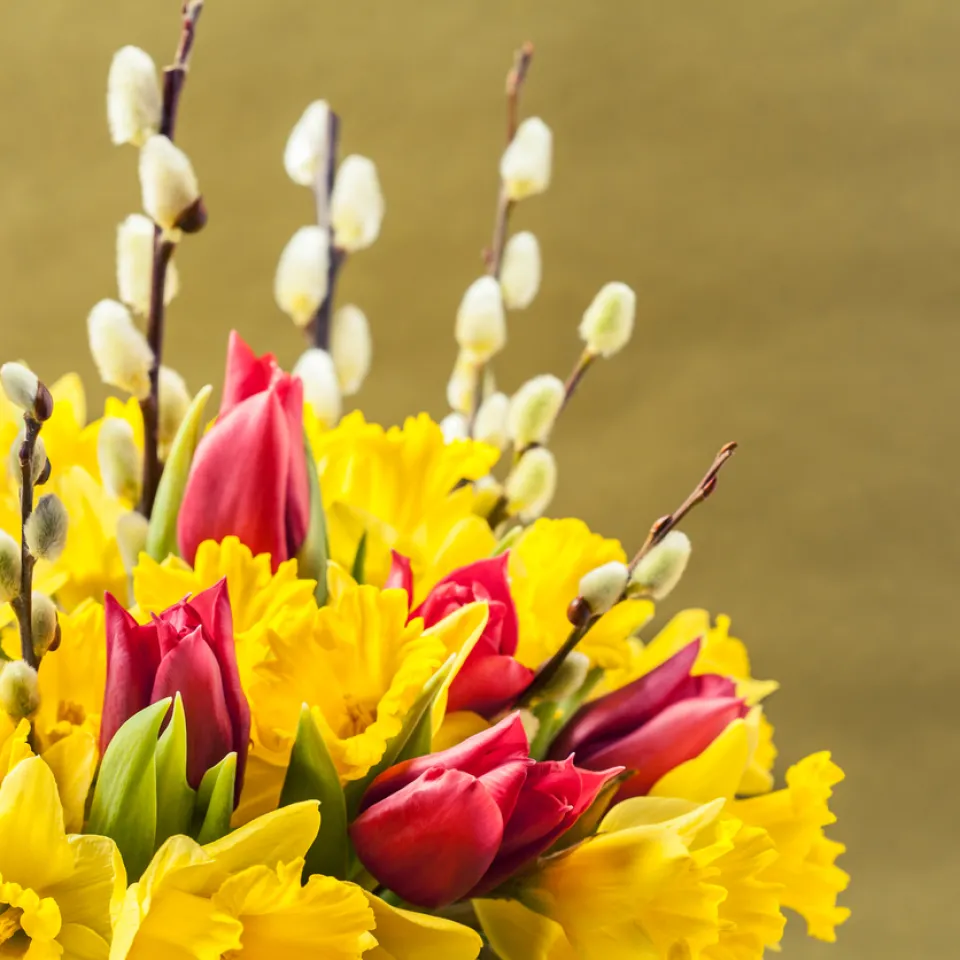 Ein klassischer Osterstrauß: Narzissen, Tulpen und Weidenkätzchen.
