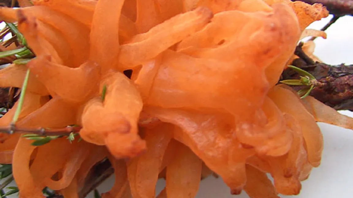 Bei dem Übeltäter handelt es sich um den pilzlichen Krankheitserreger Gymnosporangium sabinae. Es ist ein wirtswechselnder Pilz, der gleichzeitig Birnbäume und anfällige Wacholderarten befällt. Das sind annähernd die Hälfte aller Zierwacholder, an deren Trieben der Pilz überwintert.