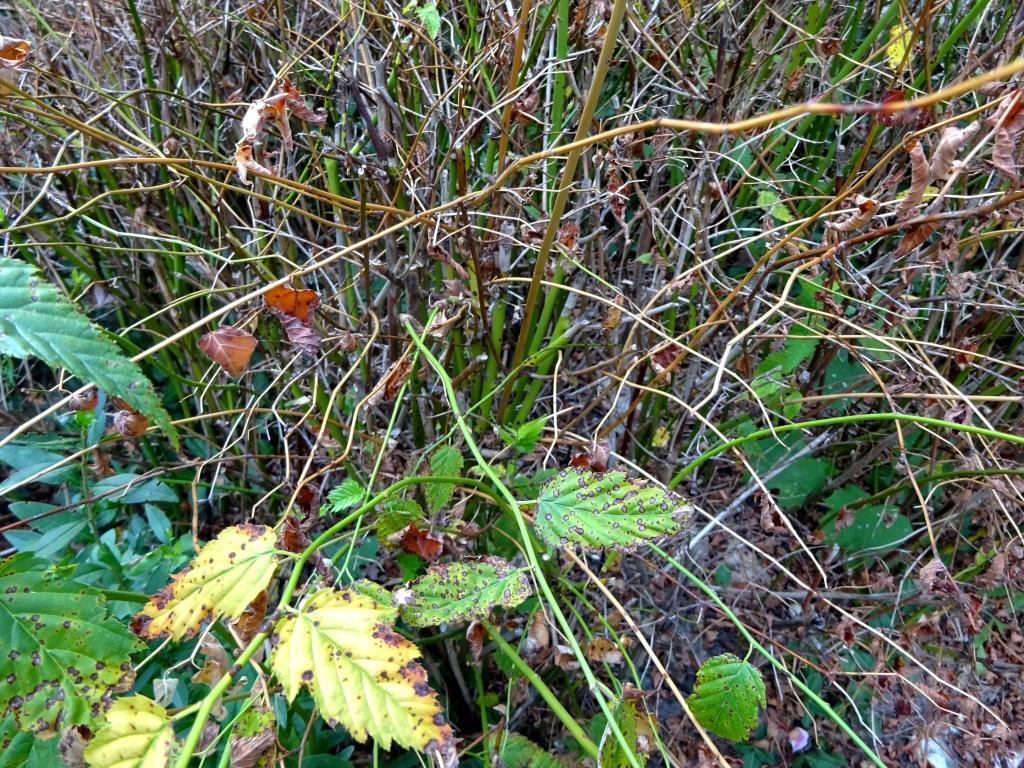Blumeriella kerriae befällt aber auch die Triebe der Pflanzen. Es zeigen sich mehrere Millimeter große rundlich-ovale, braune Flecken, die auch zahlreich auftreten können. Hier bilden sich die Sporen der Nebenfruchtform (Konidien), die die Krankheit im Bestand ebenfalls weiter verbreiten. Nach der Winterruhe werden im Frühjahr wieder Konidien produziert, die mit den auf dem infizierten Falllaub gebildeten Ascosporen ein hohes Infektionspotenzial darstellen.