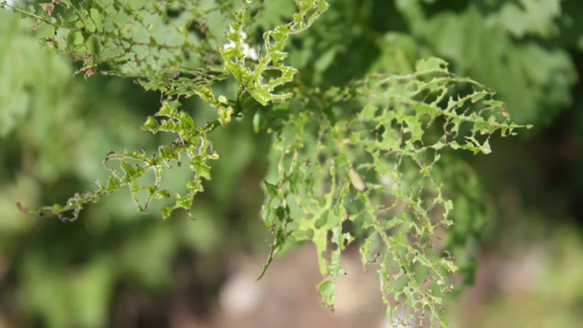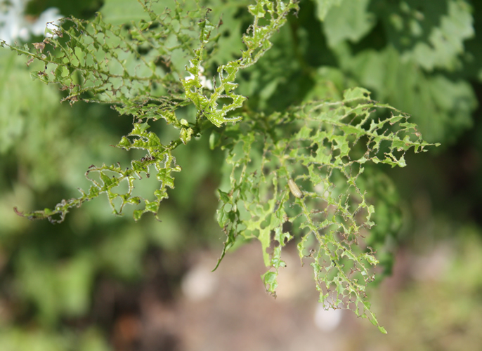 Die Larven des Schneeballblattkäfers fressen die Blätter bis auf die Rippen ab