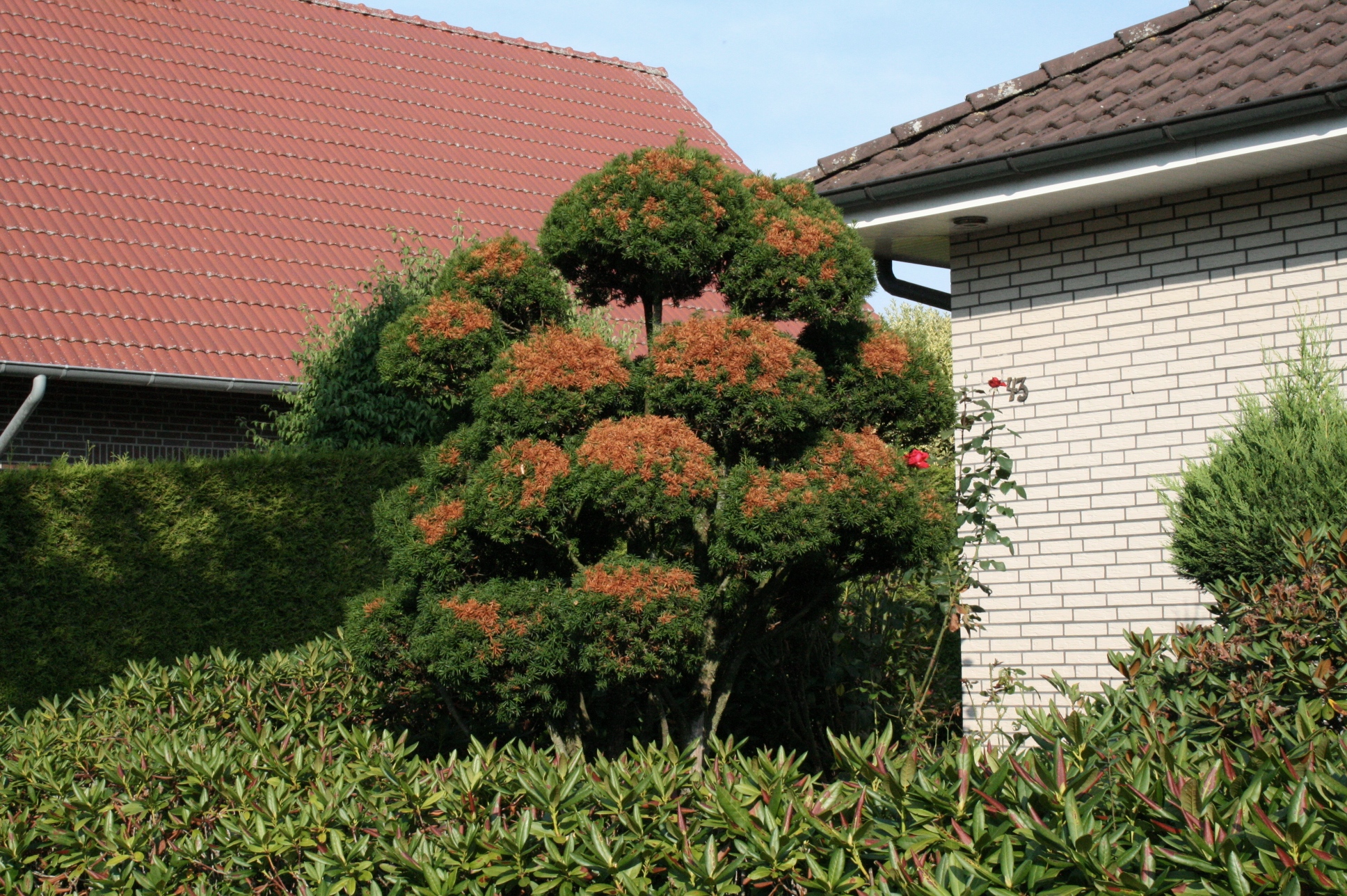 Selbstverständlich können sich Blätter oder Nadeln auch durch Schäden braun färben, zum Beispiel Frost, Hitze, Trockenheit, Schaderreger oder den Kontakt mit Auftausalz. Dann werden Blätter und Nadeln nicht nur braun, sondern auch trocken und sterben ab. Meist sind dann deutliche Abgrenzungen zwischen dem abgestorbenen, braunen Pflanzengewebe (auch im Holz) und den gesunden, noch grünen Pflanzenteilen erkennbar. Auch hier sollte die Ursache der Schäden zunächst sicher bestimmt und dann möglichst abgestellt werden. Vertrocknete, braune Zweige können abgeschnitten und je nach Ursache kompostiert oder über den Biomüll entsorgt werden. Auch solche Schäden können mit erheblicher Zeitverzögerung auftreten, Trockenschäden an Thuja-Hecken zeigen sich zum Beispiel durch Absterben von Nadeln und Trieben oft erst im Frühjahr und Sommer des Folgejahres.