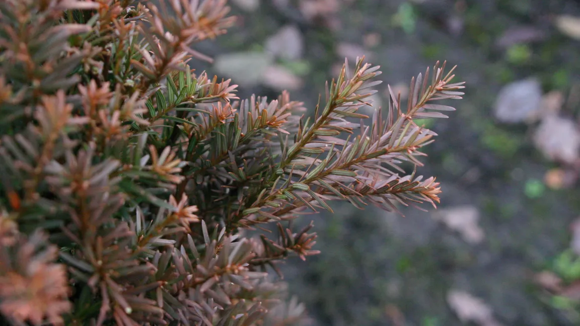 Im Winter färben sich die Nadeln beziehungsweise die Blätter immergrüner Gehölze wie Eibe, Thuja oder Buchsbaum manchmal bräunlich. Sie vertrocknen allerdings nicht, sondern werden im Frühjahr bei wärmeren Temperaturen wieder grün.