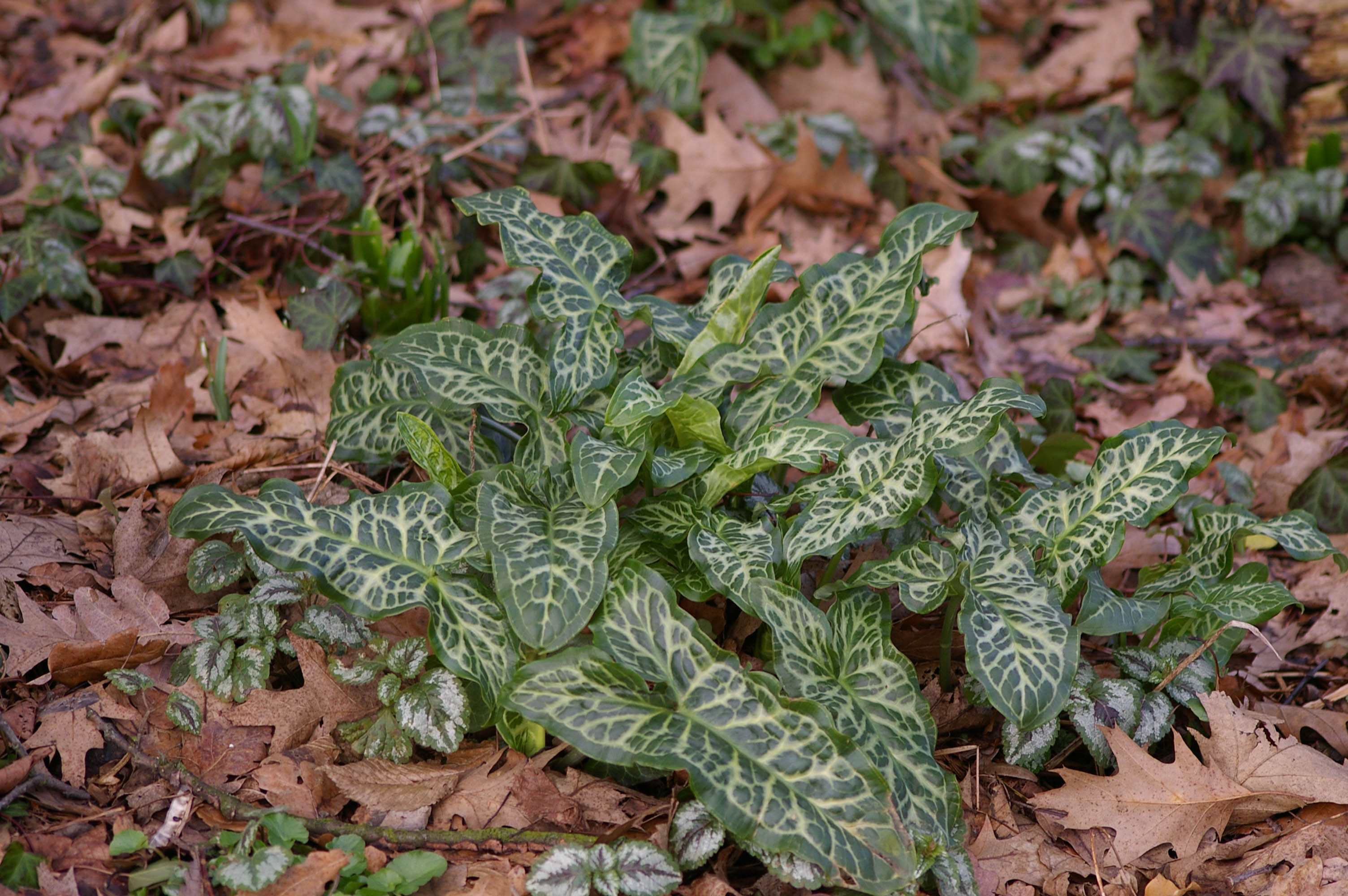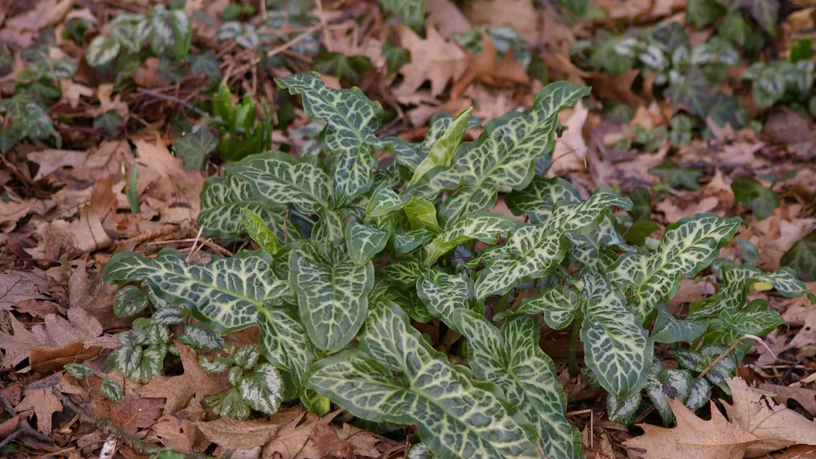 Der Aronstab ist eine ausdauernde krautige Pflanze mit einer Knolle als Überwinterungsorgan, die zwischen 20 und 40 Zentimeter in die Höhe wächst. Die grundständigen Laubblätter sind langstielig und pfeilförmig. Je nach Population können sie eine weiße Marmorierung (Arum italicum) oder dunkle Flecken aufweisen. Von den Flecken hat Arum maculatum zwar seinen Namen, diese zeigen sich aber nicht zwangsläufig. Jetzt im Winter sind die Blätter des Italienischen Aronstabs in ihrer vollen Pracht zu bewundern, noch bis nach der Blüte im Frühjahr. Die Blätter des heimischen Aronstabs zeigen sich dagegen erst zur Blütezeit im Frühling. Dann besteht beim Bärlauchsammeln im Wald Verwechslungsgefahr. Und zwar nicht, weil sich die Blätter beider Pflanzen so ähnlich sähen, sondern weil sich die Aronstab-Blätter unter den dichten Blattteppichen des Bärlauchs verstecken und unbemerkt in den Sammelkorb gelangen können.