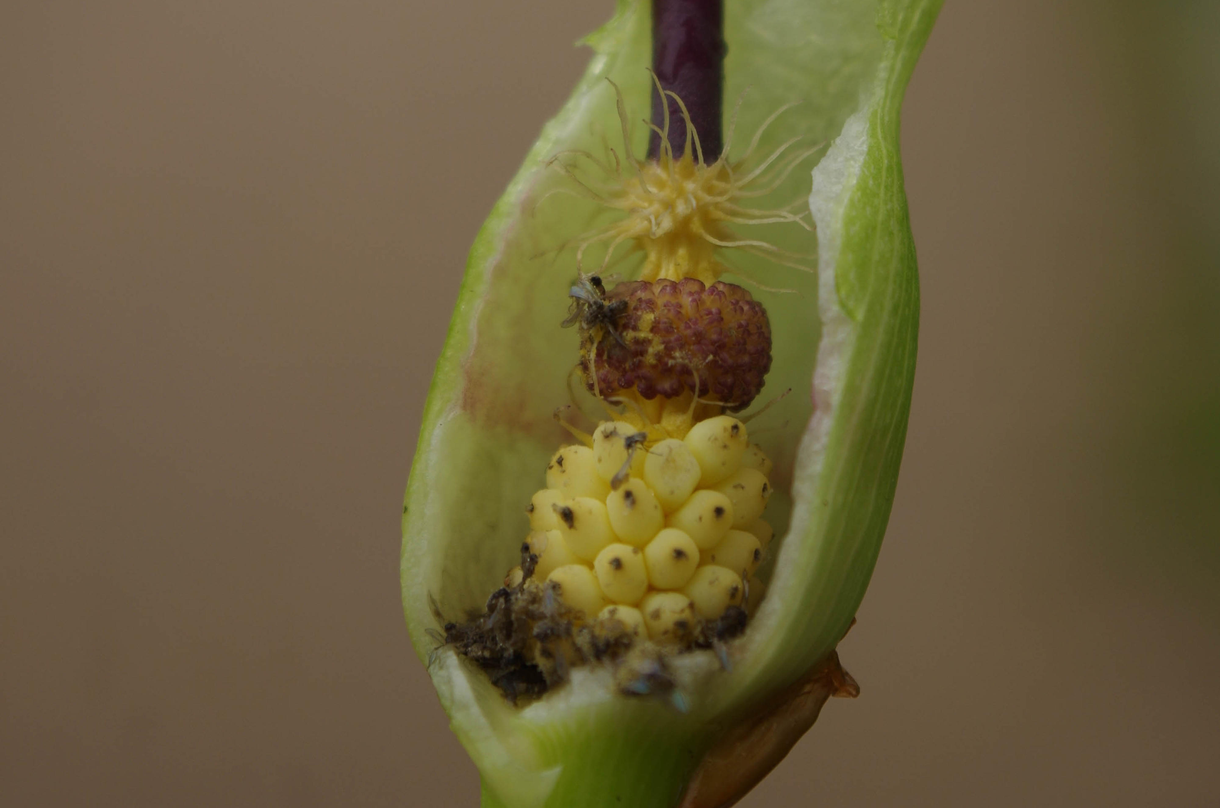Der Blütenstand des Aronstabs ist von einem charakteristischen, weiß-grünlichen Hochblatt umgeben, das Spatha genannt wird. Dieses tütenförmig eingerollte Blatt bildet eine sogenannte Kesselfalle für bestimmte Bestäuberinsekten wie Aasfliegen oder Schmetterlingsmücken. Die Insekten werden durch den aasartigen Geruch des Kolbens angelockt und fallen ins Kesselinnere, wo sie die Blüten bestäuben. Wenn das Blütenblatt welkt, gelangen die Insekten wieder ins Freie. Dann bilden sich die Fruchtstände, die im Herbst leuchtend rote Beeren tragen.