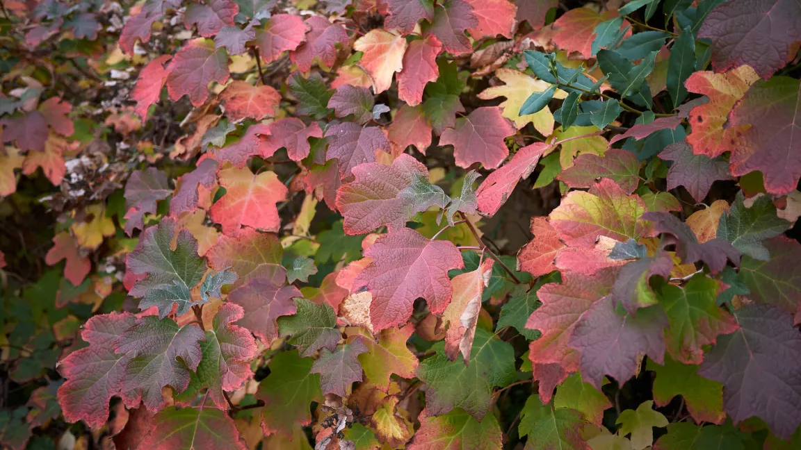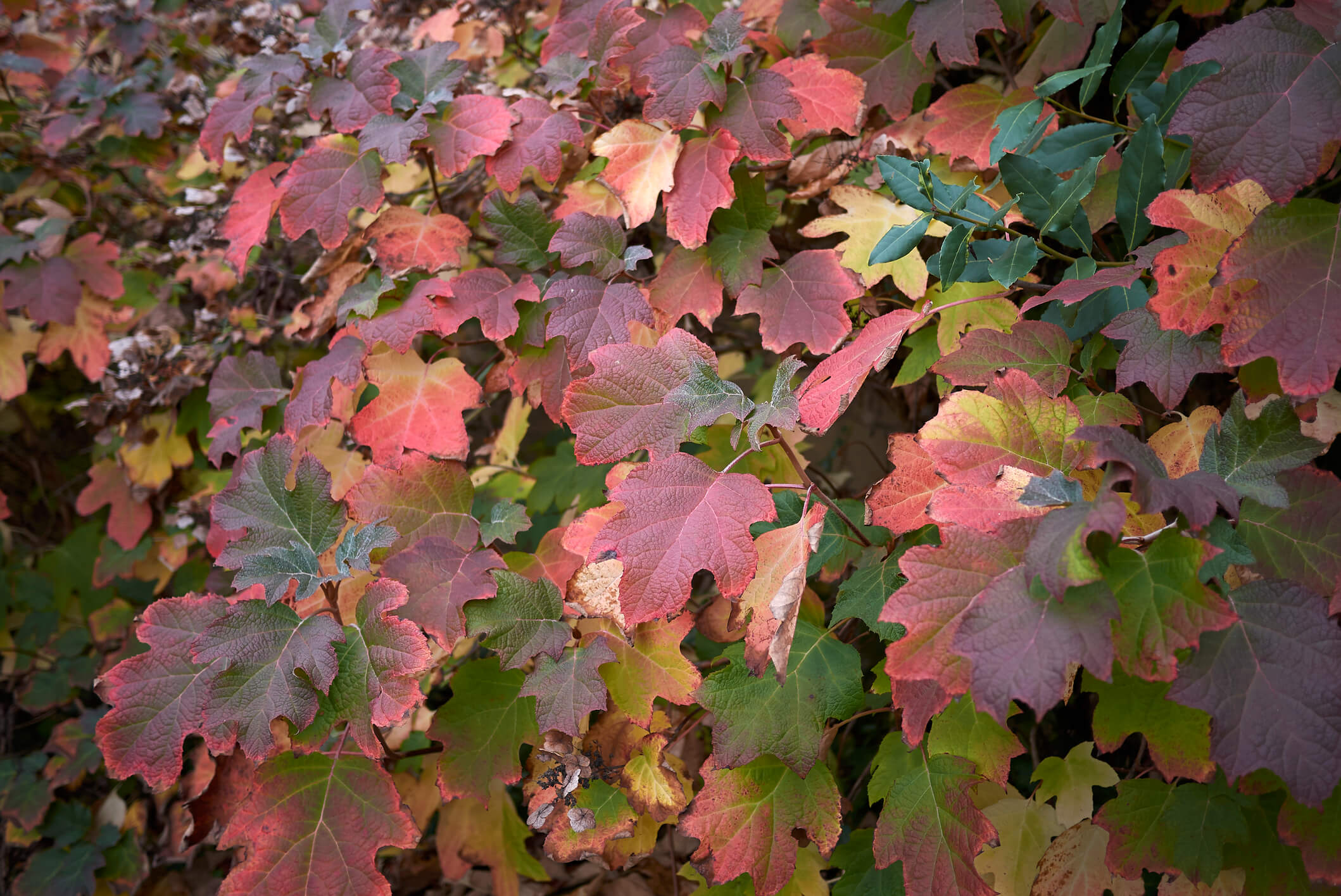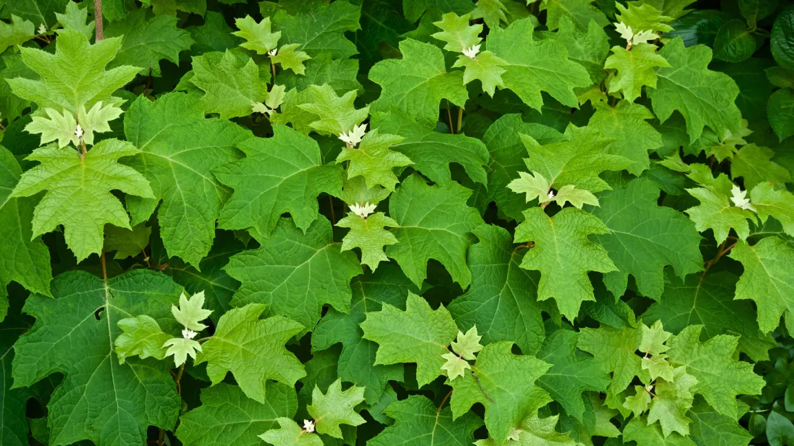 Bei der Eichenblatt-Hortensie, auch Eichen-Hortensie oder Eichenblättrige Hortensie genannt, wird schnell klar, woher sie ihren Namen hat: Die Form der Blätter erinnert mit den drei, fünf oder sieben Lappen stark an Eichenlaub. Jedoch weniger an das Laub unserer heimischen Stiel-Eiche (Quercus robur) als an das der Amerikanischen Roteiche (Quercus rubra). Genau wie dieses nimmt das Laub der Eichen-Hortensie im Herbst eine leuchtendrote Färbung an. Die Blätter sind fiedrig gelappt, 8 bis 20 Zentimeter lang und fast ebenso breit. Während die Blattoberseite runzelig ist, ist die Unterseite mehr oder weniger dicht filzig behaart und weist häufig deutlich hervortretende Blattnerven auf. Weil die Laubblätter bis in das neue Jahr hinein an den Trieben bleiben, gelten Eichenblatt-Hortensien auch als Halbimmergrüne.