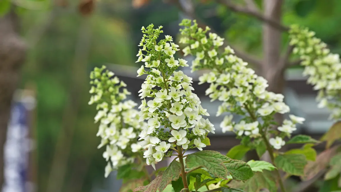 Die kegelförmigen Blütenrispen der Eichenblatt-Hortensie werden bis zu 30 Zentimeter lang. Während bei den kleinblütigeren Sorten die Rispen aufrecht stehen, neigen diese bei den großblütigen Sorten zum Herabhängen. Bei fast allen Sorten verfärben sich die vielen kleinen, zuerst cremeweißen Blüten beim Abblühen rosa oder rötlich.