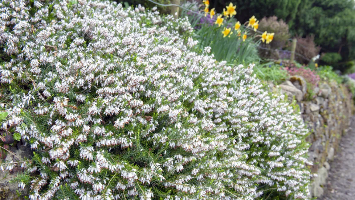 - Erica carnea „Snow Queen“ besticht mit frischgrünem Laub und weißen Blüten, die sich von Januar bis April zeigen.