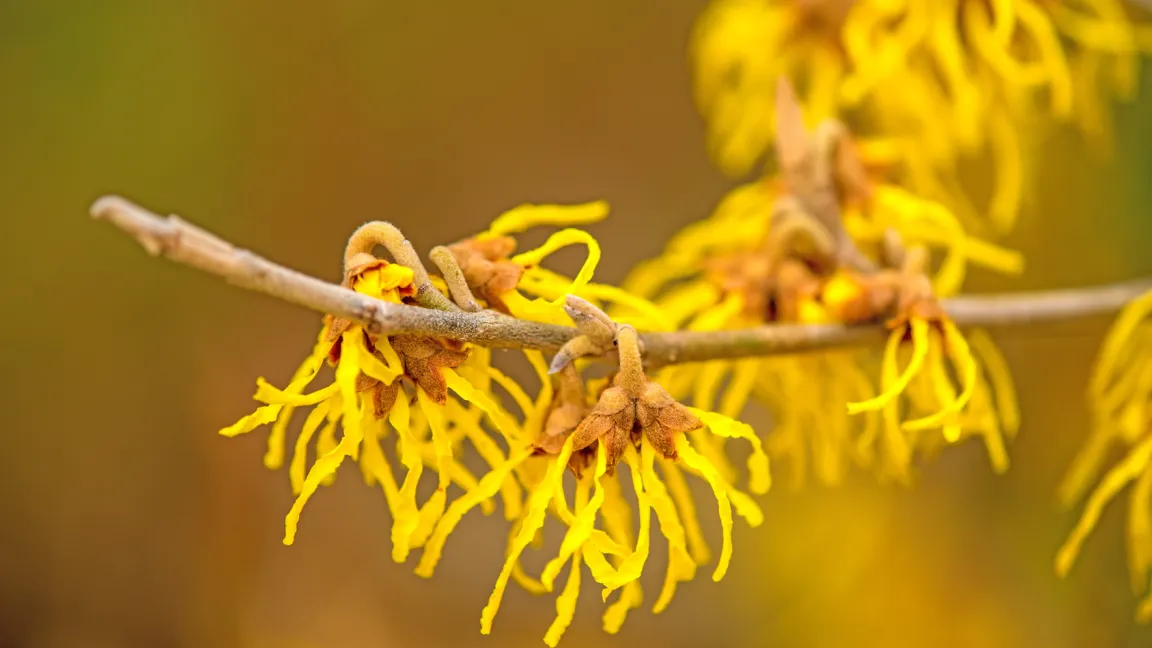 Hamamelis mollis: Die chinesische Zaubernuss blüht von Januar bis März in goldgelber Farbe. Auch die Blätter färben sich im Herbst goldgelb.