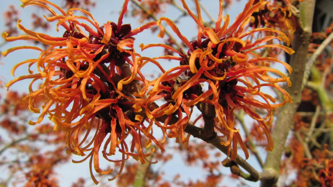 Hamamelis intermedia 'Jelena': Sie blüht bereits ab Dezember bis teilweise Ende März. Ihre großen Blüten sind orangerot bis kupferfarben gefärbt und gehen zu den Spitzen hin in orange bis orangegelb über. Das Laub leuchtet im Herbst orange bis scharlachrot.