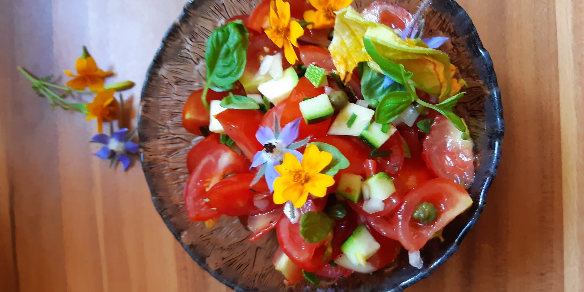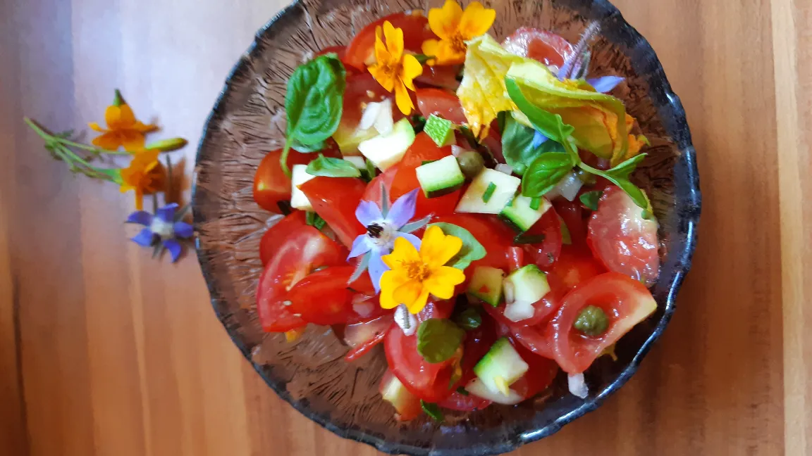 Nicht nur die Blüten vieler Gartenkräuter wie Kapuzinerkresse, Majoran und Thymian oder Gemüsepflanzen wie Kürbis und Zucchini, sind genießbar. Auch die Blüten vieler Zier- und Wildpflanzen verschönern manches Menü. Die Auswahl ist im Sommer groß: Zum Garnieren von Salaten sind vor allem Gänseblümchen mit ihrem nussigen Aroma und Ringelblumen, auch „Safran der armen Leute“ genannt, beliebt. Ebenso lassen sich Blüten von Stiefmütterchen, Hornblumen, Petunien, Löwenzahn, Flammenblumen, Begonien und Dahlien verwenden. Ein besonderer Hingucker ist die Borretsch-Blüte. Dekorativ auf dem Teller sind auch Sonnenblumen-, Schmuckkörbchen-, Malven-, Gladiolen-, Chrysanthemen- und Nelkenblüten. Ein erfrischender Anblick sind Blüten im Eiswürfel. Veilchen, Linde, Lavendel, Holunder und Jasmin vertragen diese Kältebehandlung. Süßspeisen lassen sich gut mit Rosenblüten verfeinern.